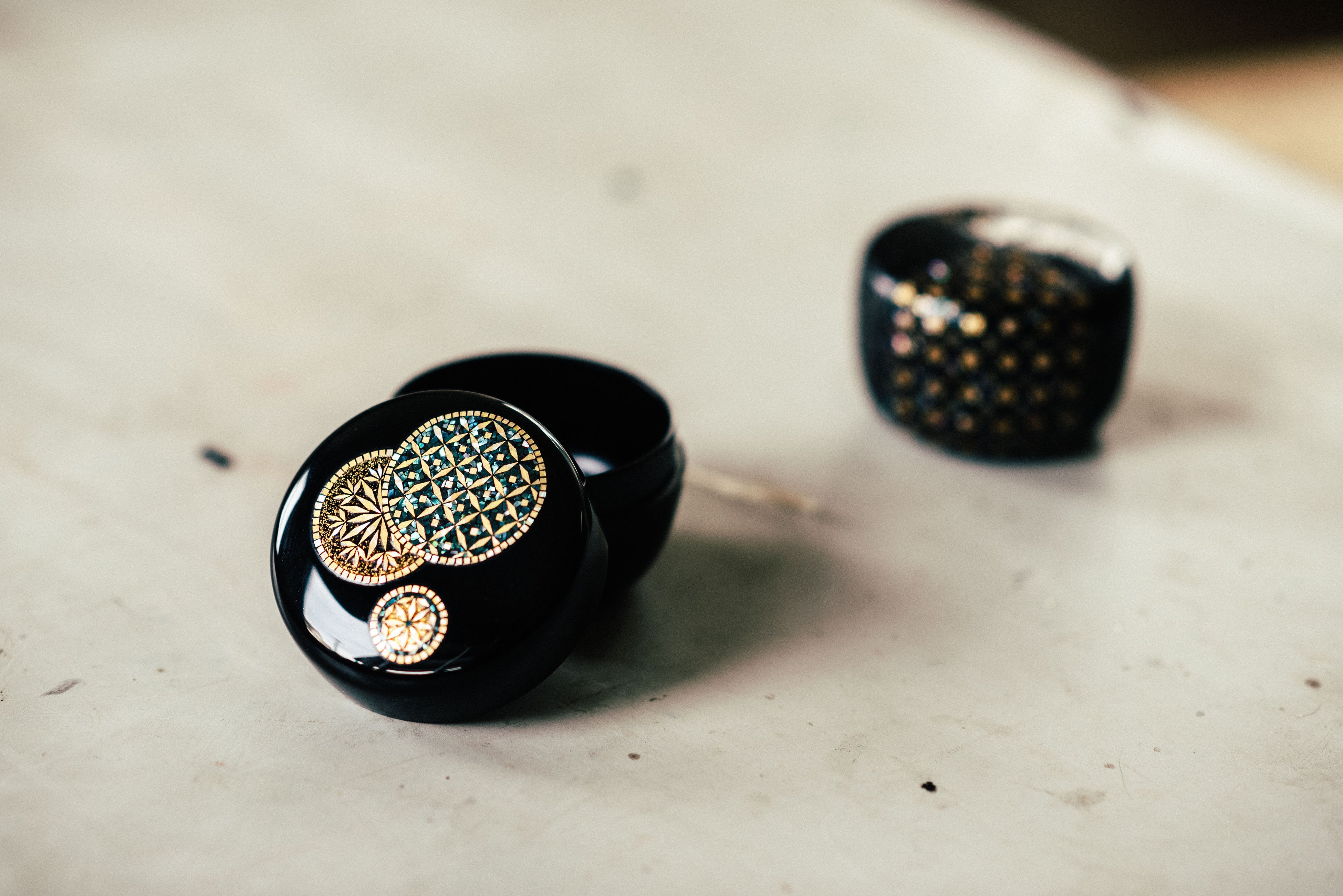 1910年創業の武蔵川工房は、その伝統技法「青貝塗」を代々継承する工房で、四代目・武蔵川剛嗣氏は若き伝統工芸士として活躍。伝統文様を現代的にアレンジし、螺鈿とカジュアルなプロダクトを組み合わせるなど、新しいものづくりにも挑戦しています。