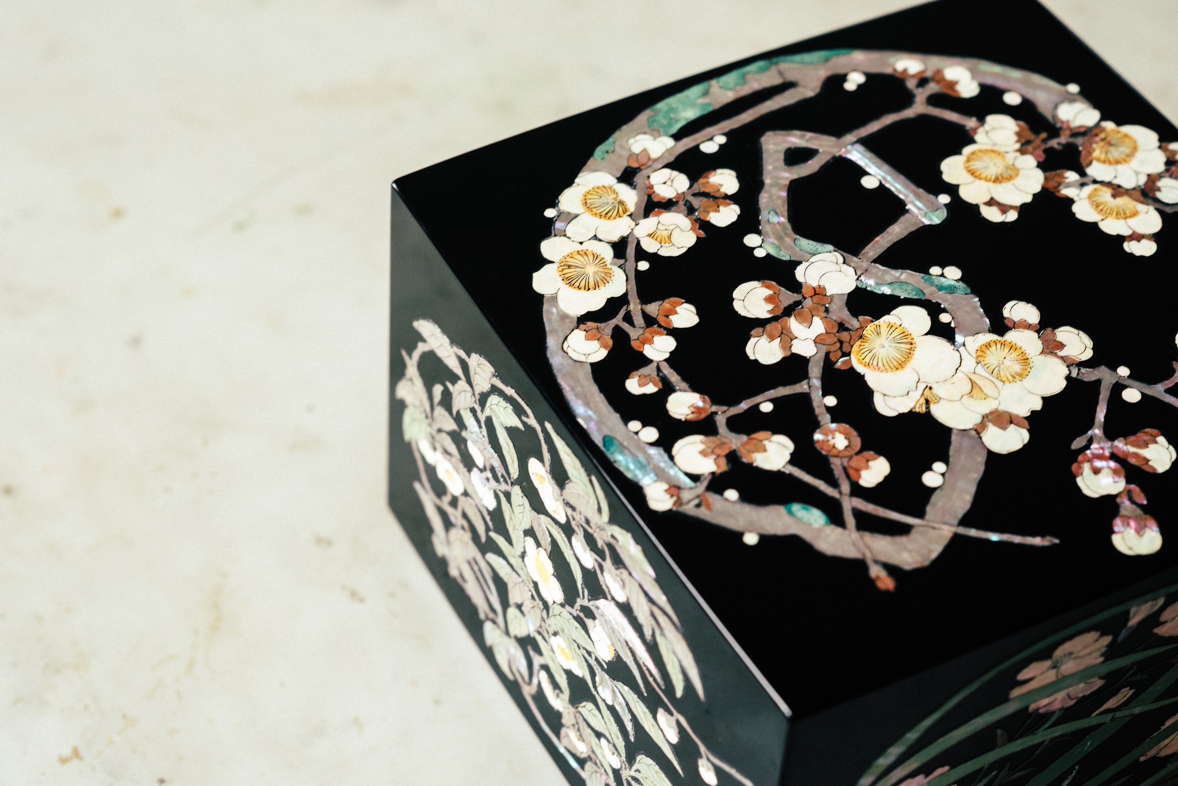 螺鈿細工の特性上、色味や模様には個体差があり、光の反射によって見え方が変化します。
