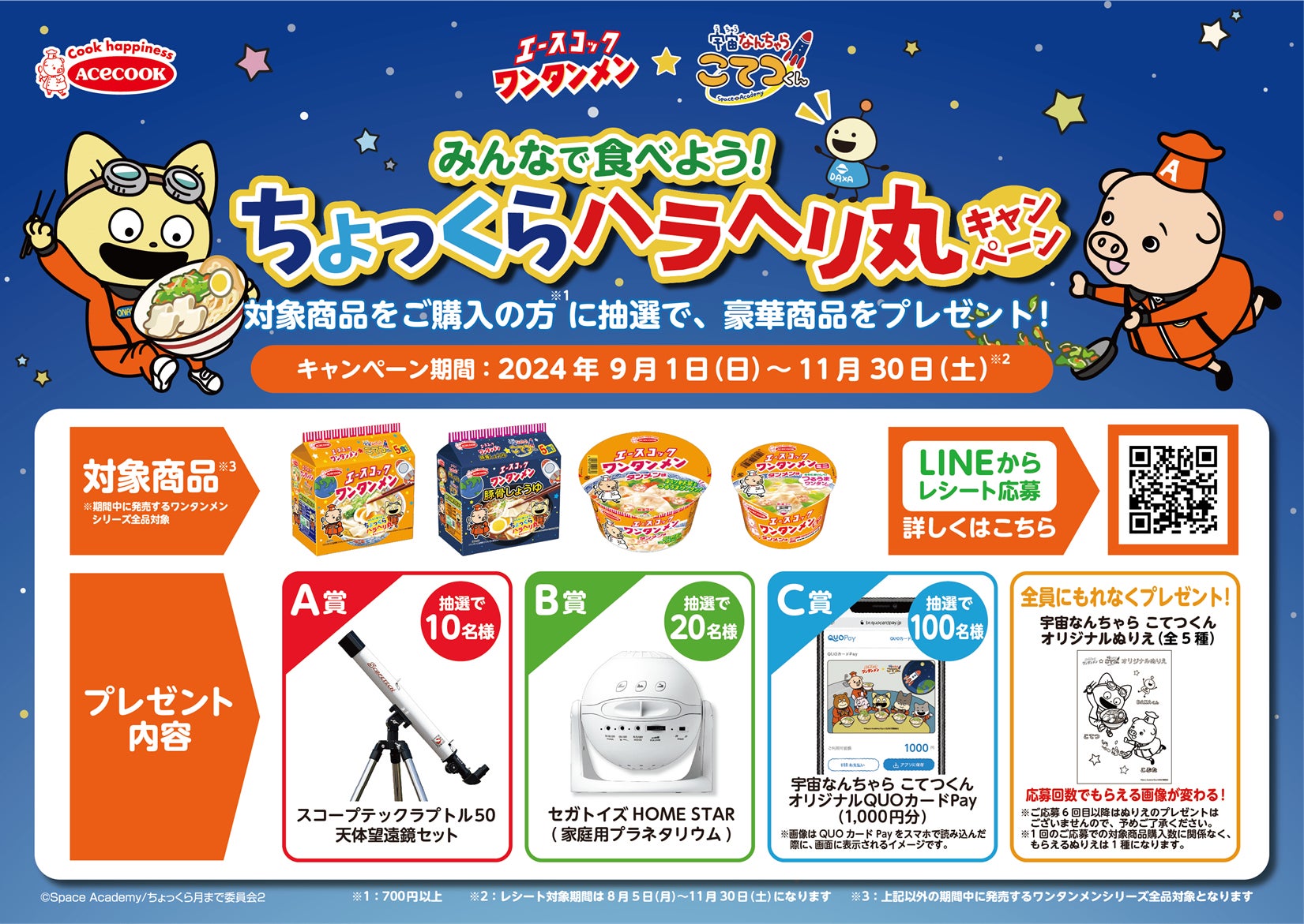 エースコック株式会社(本社:大阪府吹田市 社長:村岡寛人)では、人気アニメ「宇宙なんちゃら こてつくん」とコラボした【ワンタンメン★宇宙なんちゃら こてつくん みんなで食べよう!ちょっくらハラヘリ丸キャンペーン】を実施します。