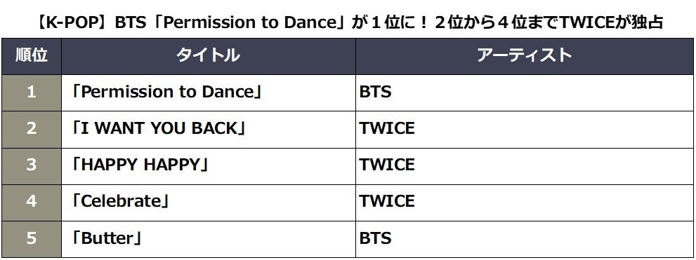 発表部門:邦楽トップ10、洋楽トップ10、K-POPトップ10※1、