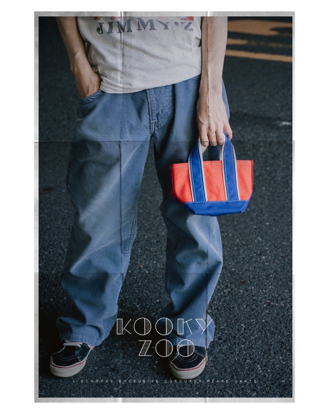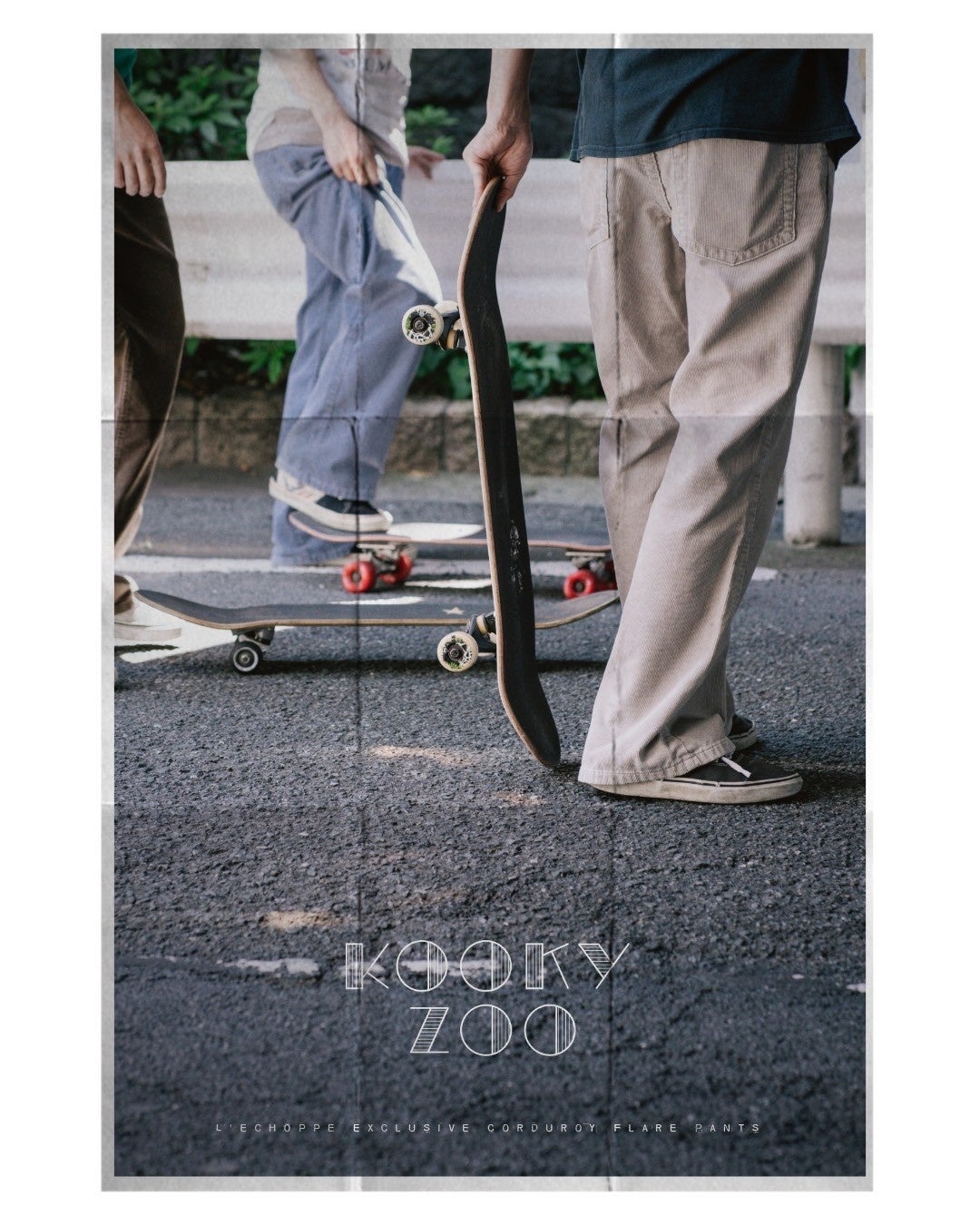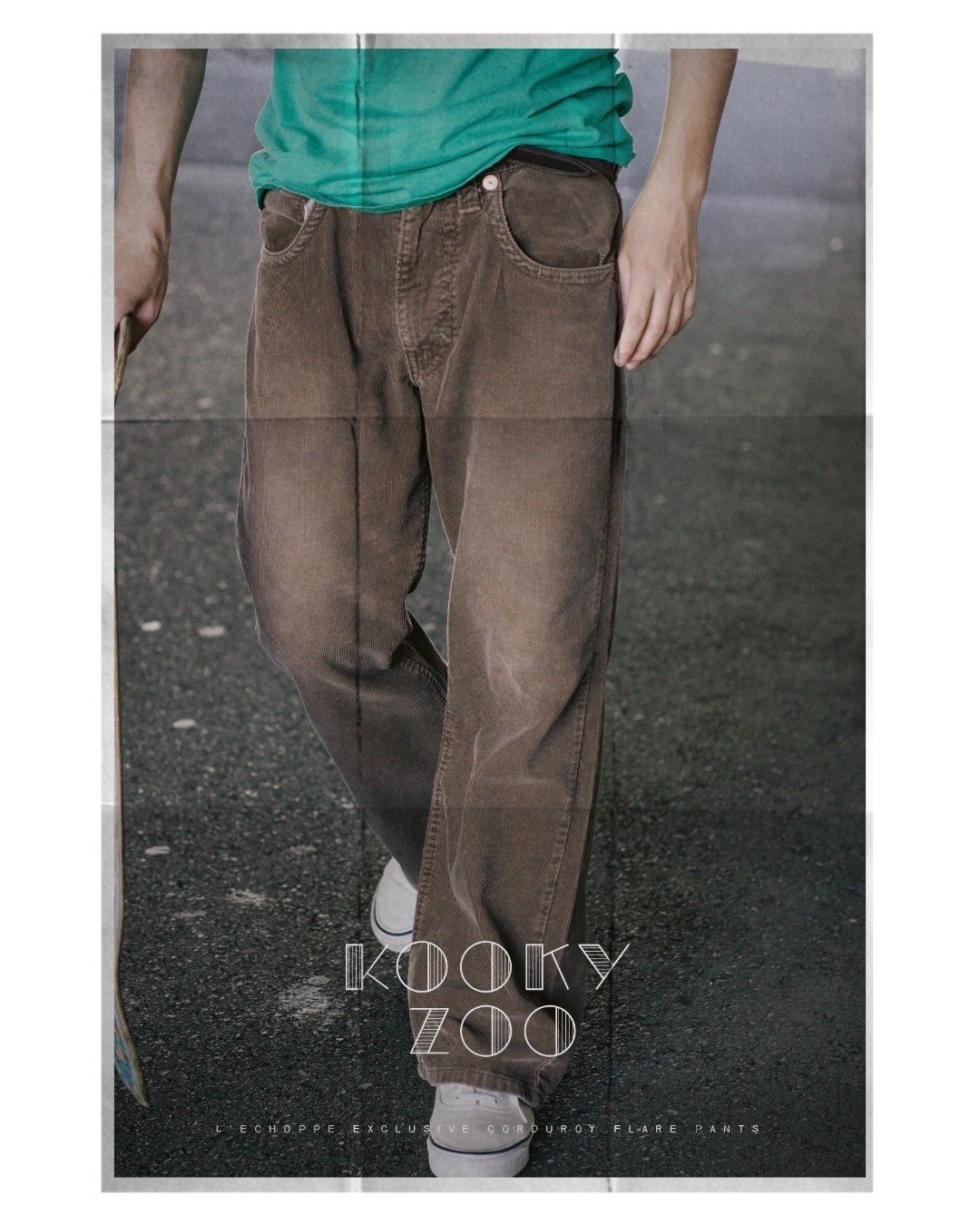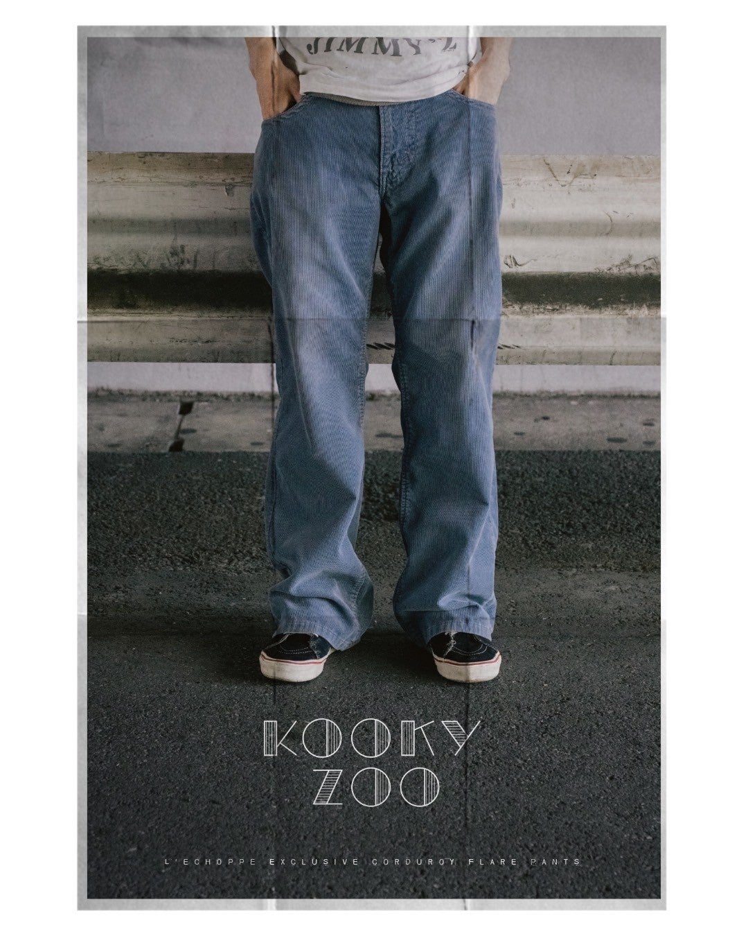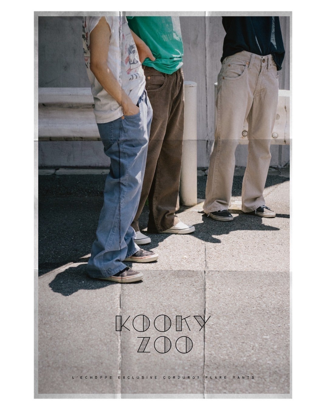 世界で初めてのブーツカットジーンズであるリーバイス517。ウエスタンファッションはもちろん、映画『ロード・オブ・ドッグタウン』のスケーターたちが着こなすスタイルに憧れた人は数多くいるだろう。KOOKY ZOOデザイナー・鈴木氏もその一人。ブランドの定番アイテムであるフレアデニムも、517のキッズモデル317をモチーフにしてつくられた。レショップでは、そのモデルをベースに素材を置き換えたサマーコーデュロイパンツを別注で展開する。膝に向かって締まり、裾に向かって広がるフレアシルエット。ホームベース型のコインポケットや、絶妙な位置に配置されたベルトループ。バックポケットのカンヌキが表から見える仕様に。KOOKY ZOOらしい発想のインパクトと緻密なディテールには、ヴィンテージへの造詣が深い鈴木氏の極端なこだわりが詰まっている。カラーは、ブラウン、ブルー、グレー。サマーコーデュロイの定番的な3色をセレクトした。