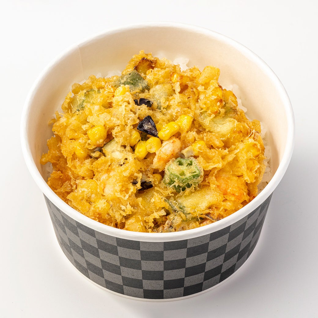 天ぷらの名店が作る、コーンやオクラ、なすなど夏野菜を使ったかき揚げ天丼です。