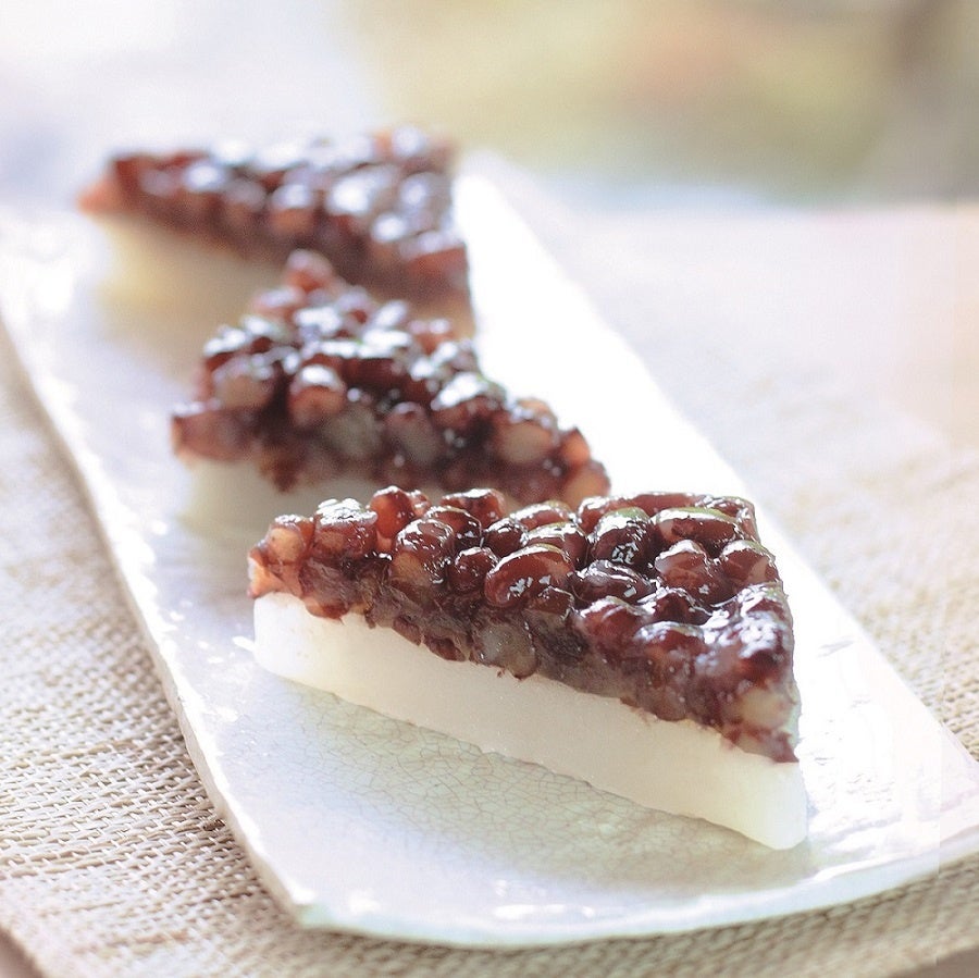もちもちとしたういろう生地に、邪気を祓う願いを込めて大納言小豆をのせました。