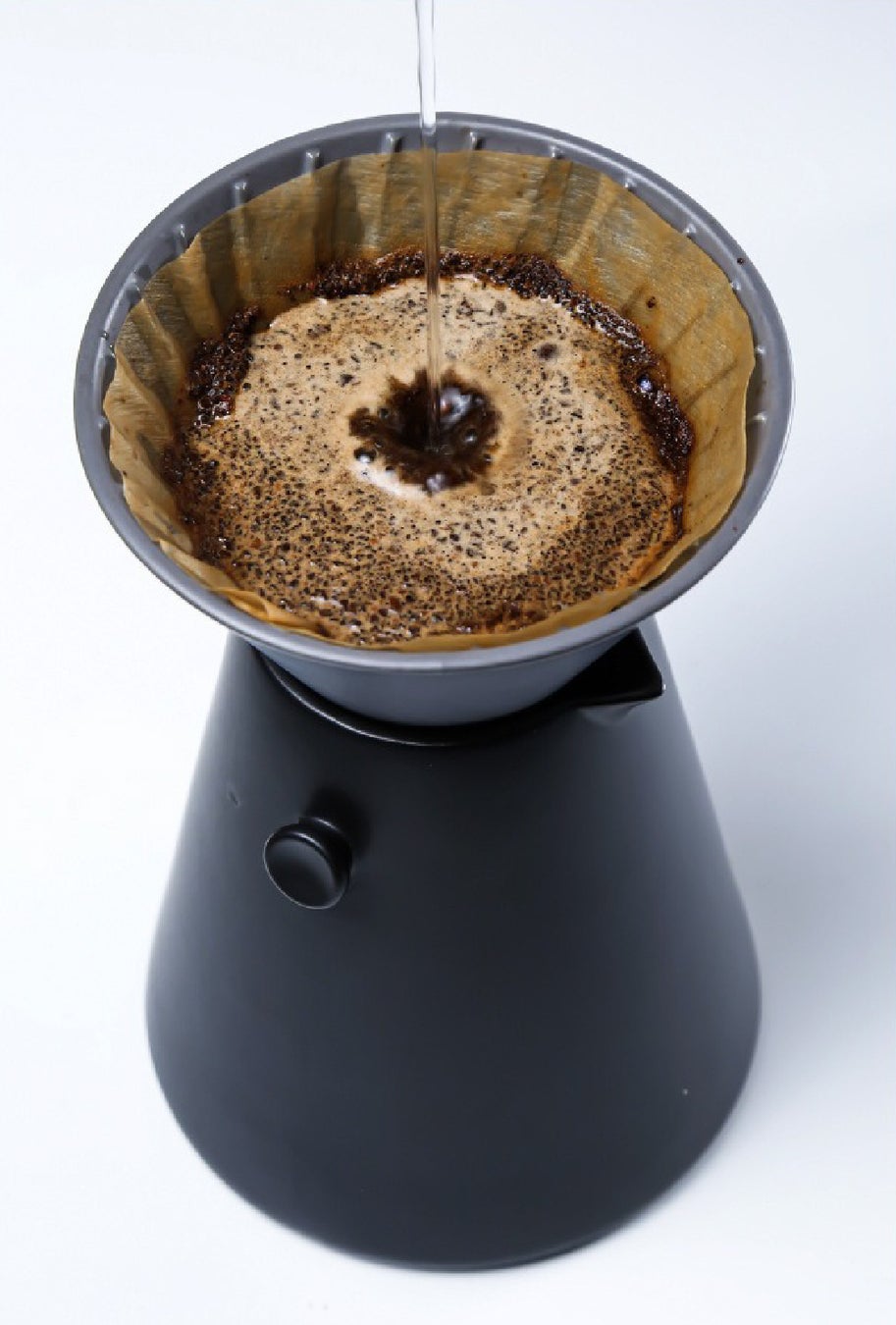 ドリッパーは底の形状がユニークで、淹れているコーヒーが底から直接漏れるのではなく、底の貯水部分にまず入り、周りの穴から漏れ出します。