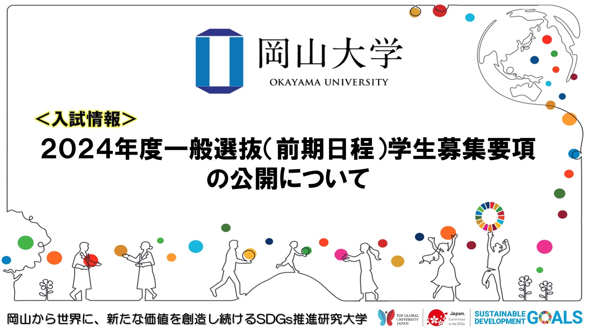 国立大学法人岡山大学(本部:岡山市北区、学長:那須保友)は、2024年度一般選抜(前期日程)学生募集要項について、以下のとおり公開しましたので、お知らせします。