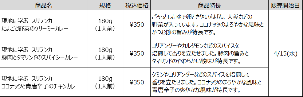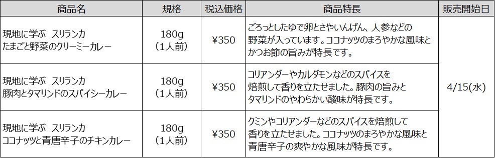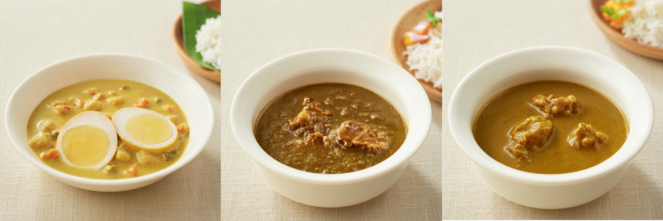 今回は、暑い地域であるスリランカで学んだ調理方法を生かし、「たまごと野菜のクリーミーカレー」、「豚肉とタマリンドのスパイシーカレー」、「ココナッツと青唐辛子のチキンカレー」の3種を発売します。スリランカカレーは比較的シンプルな調理工程で、ココナッツオイルで具材を炒めることもありますが、スパイスとともにそのまま煮込むだけの油控えめな料理が多いのが特⾧です。また、日本のルーカレーのように小麦粉を使うこともなく、野菜やココナッツミルクの甘みを生かしてつくるため、砂糖を加えず仕上げることができ、暑い夏でもさらりと食べられるカレーとなっています。
