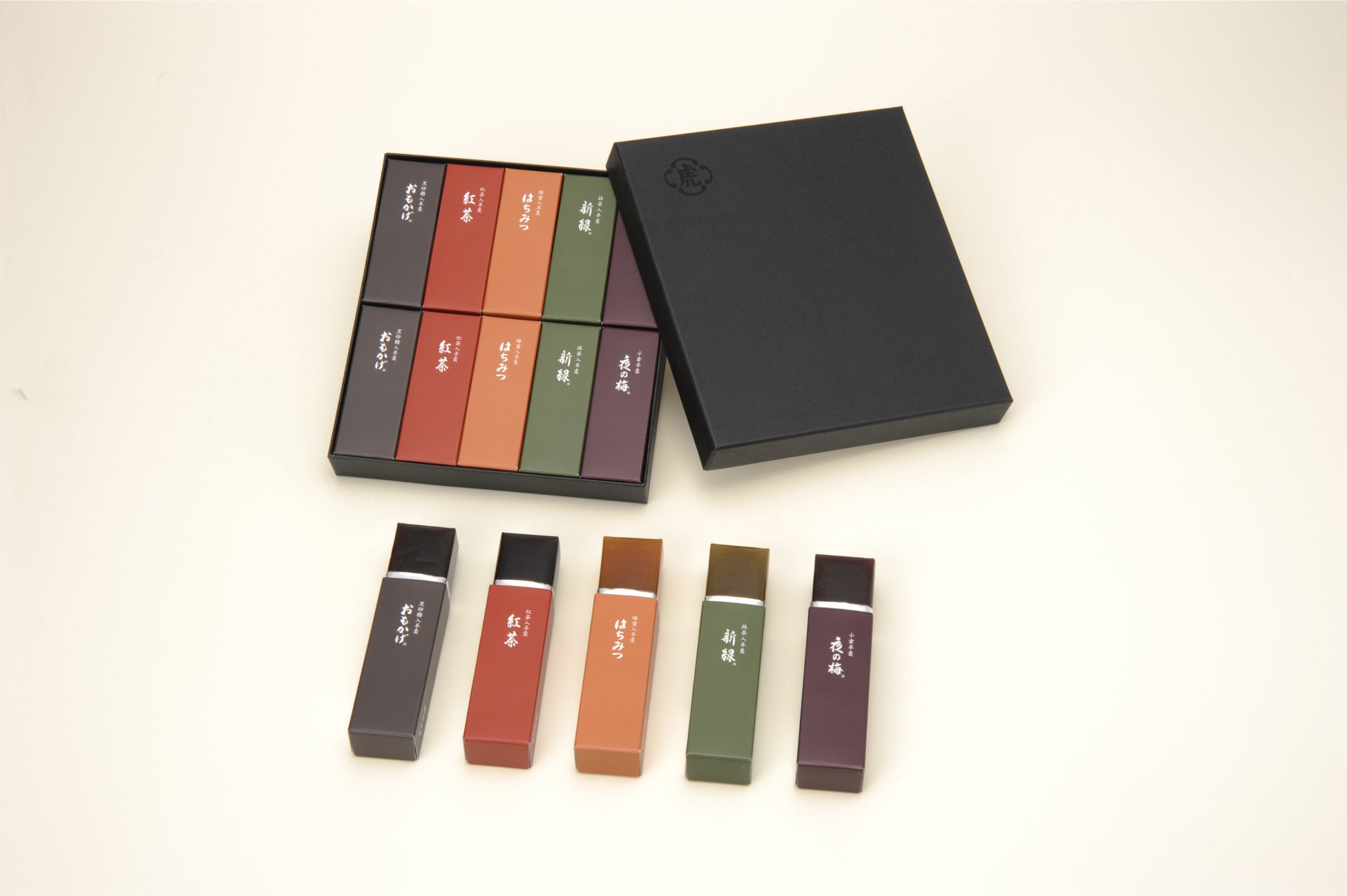 小形羊羹「夜の梅」「おもかげ」「新緑」「はちみつ」「紅茶」各2点を詰め合わせました。