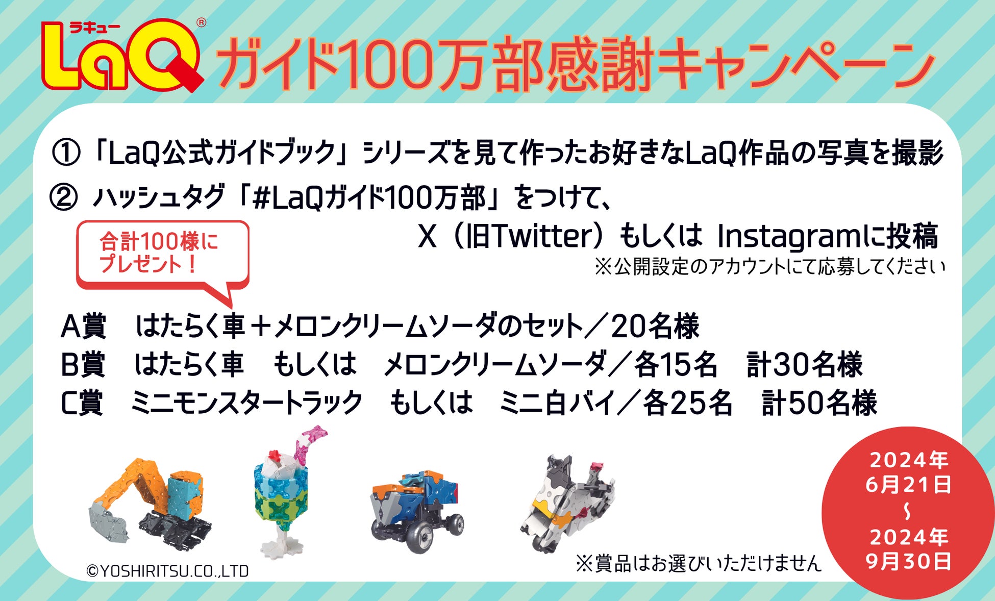 「別冊パズラー LaQ公式ガイドブック」シリーズ累計発行部数100万部突破を記念し、2024年6月に新発売されたLaQセットが合計100名様に当たる「LaQガイド100万部感謝キャンペーン」を6月21日(金)~9月30日(月)にて開催中です。奮ってご応募ください!