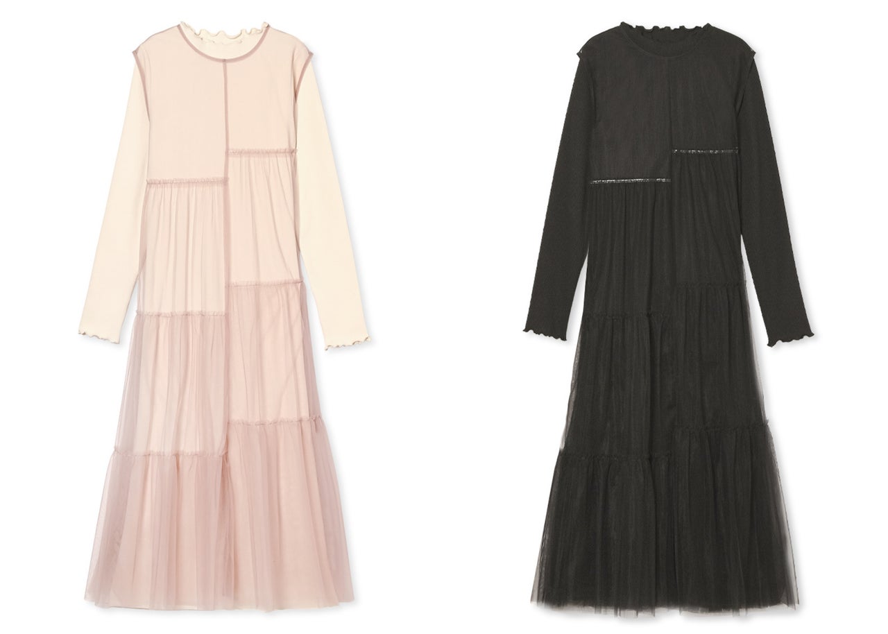 体に馴染むカットソー素材のワンピースに、繊細なティアードチュールをレイヤードしたセットワンピース。