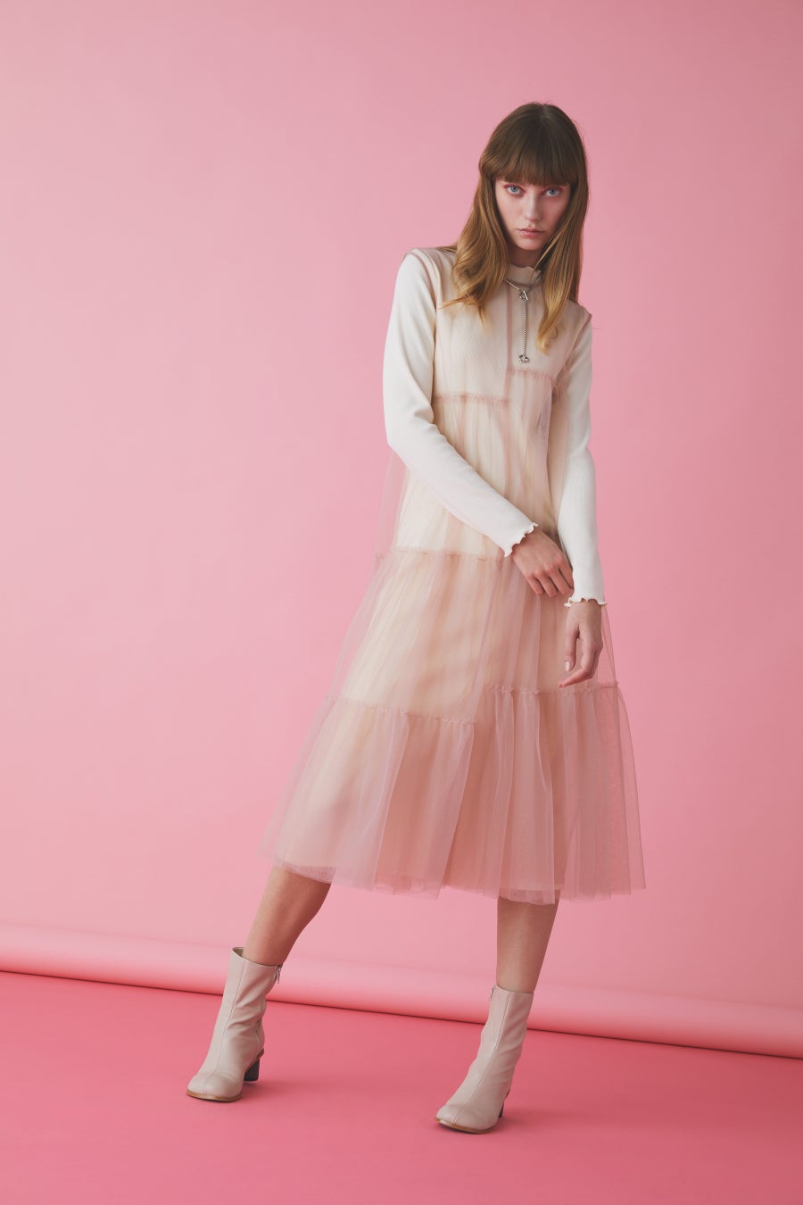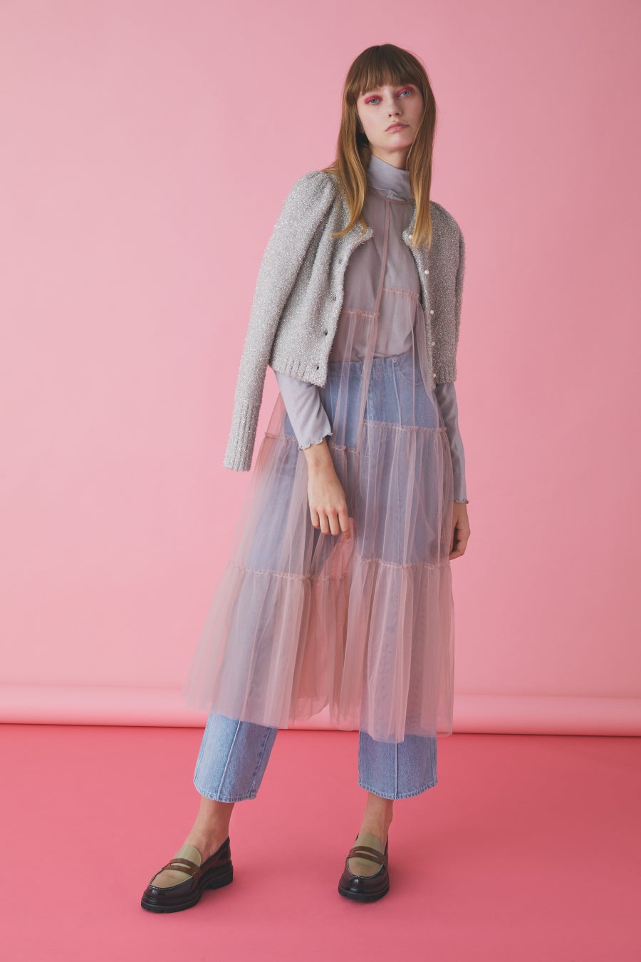 ロマンティックなピンクのチュールワンピースは、デニムやカットソーを重ねればカジュアルなスタイルにもマッチ。