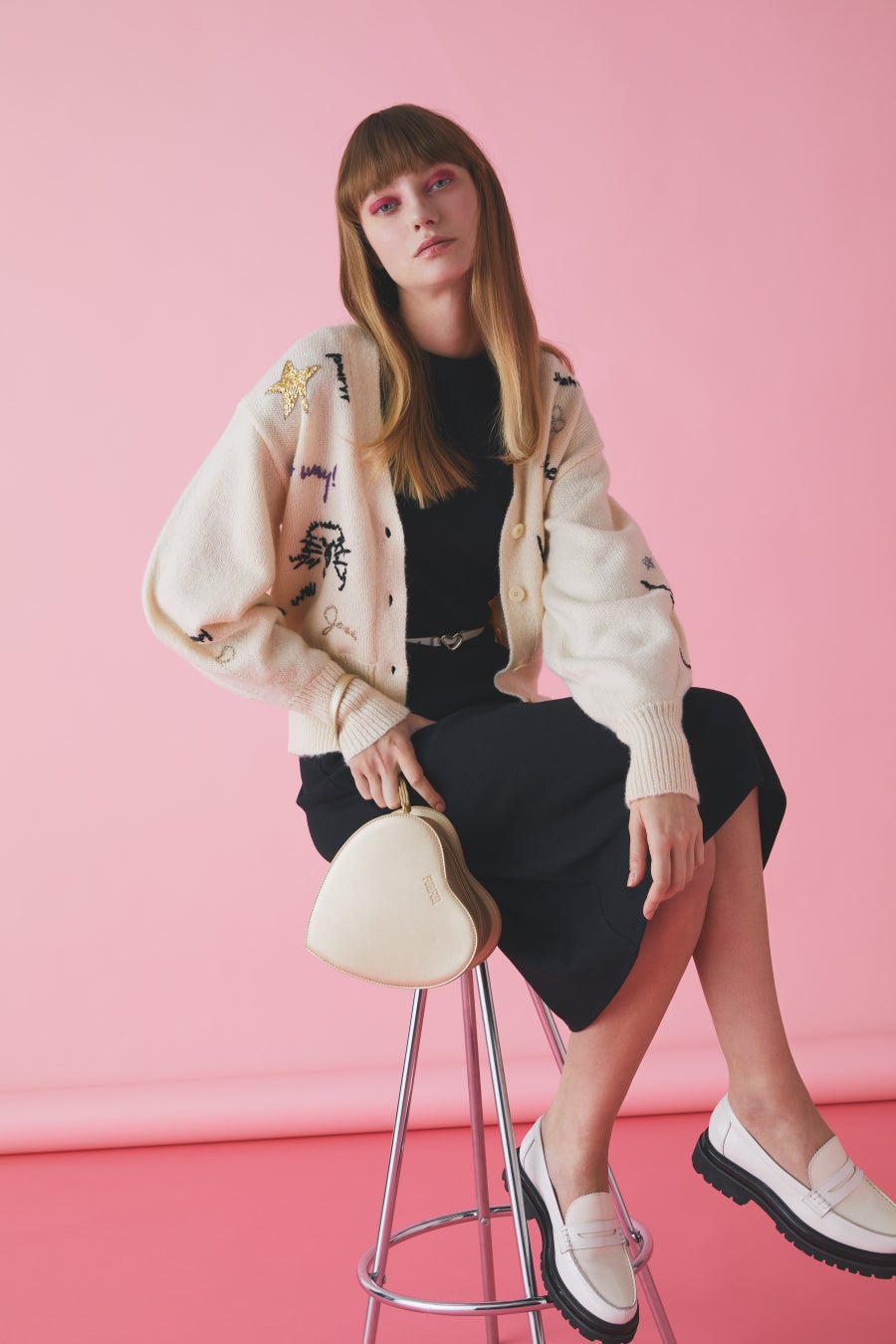 キャッチーな印象を誘うハート型ハンドバッグやハートチャームのベルトで大人スウィートを堪能。