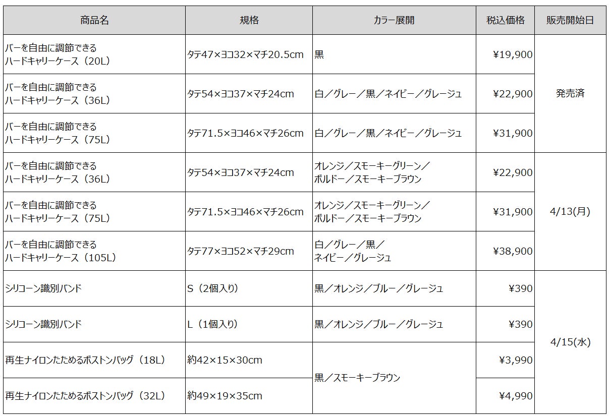 また、今回のキャリーケースリニューアルにあわせ、移動時の使いやすさや見分けやすさを高めるトラベル用品の拡充を行います。ケーブルをまとめる用途に加え、キャリーケースやポーチなどの目印としても使える「シリコーン識別バンド」や、日常使いから旅行まで幅広く使える、汎用性のある「再生ナイロンボストンバッグ」を新たに発売します。旅行のシーンではもちろん、日常使いにも活躍するアイテムです。