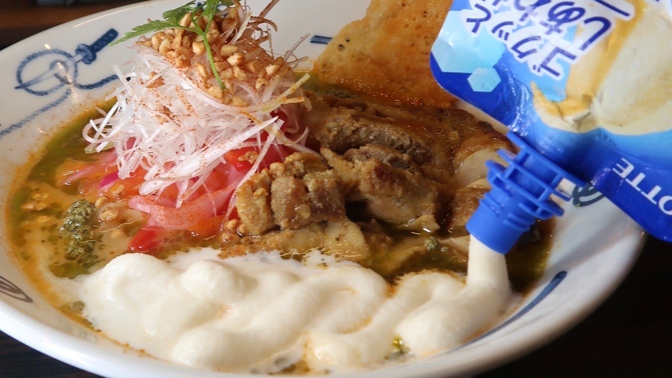 「クーリッシュ」は微細氷入りのスッキリとした甘さと、冷たく心地よい食感をワンハンドで楽しめる“飲むアイス”です。今回のコラボレーションではスパイスの効いたグリーンカレー風味の冷やしラーメンに、勇気を振り絞り「ミニクーリッシュ バニラ」をトッピングすることで完成する、夏にこそ食べたい氷点下へ誘う『クーリッシュ咖冷麺』が誕生しました。