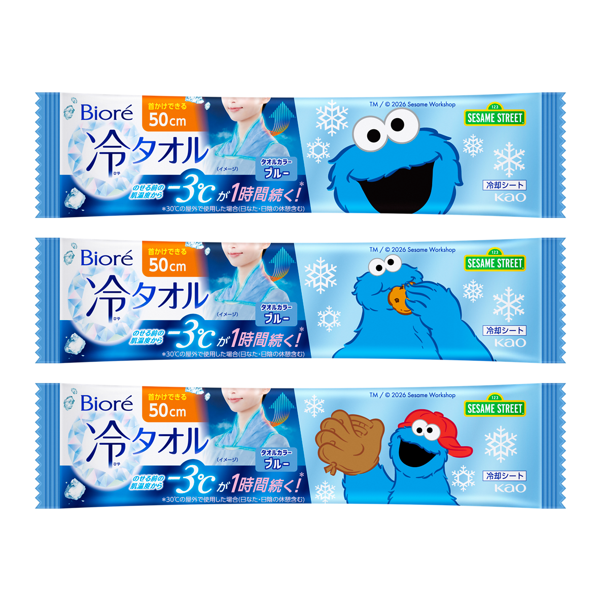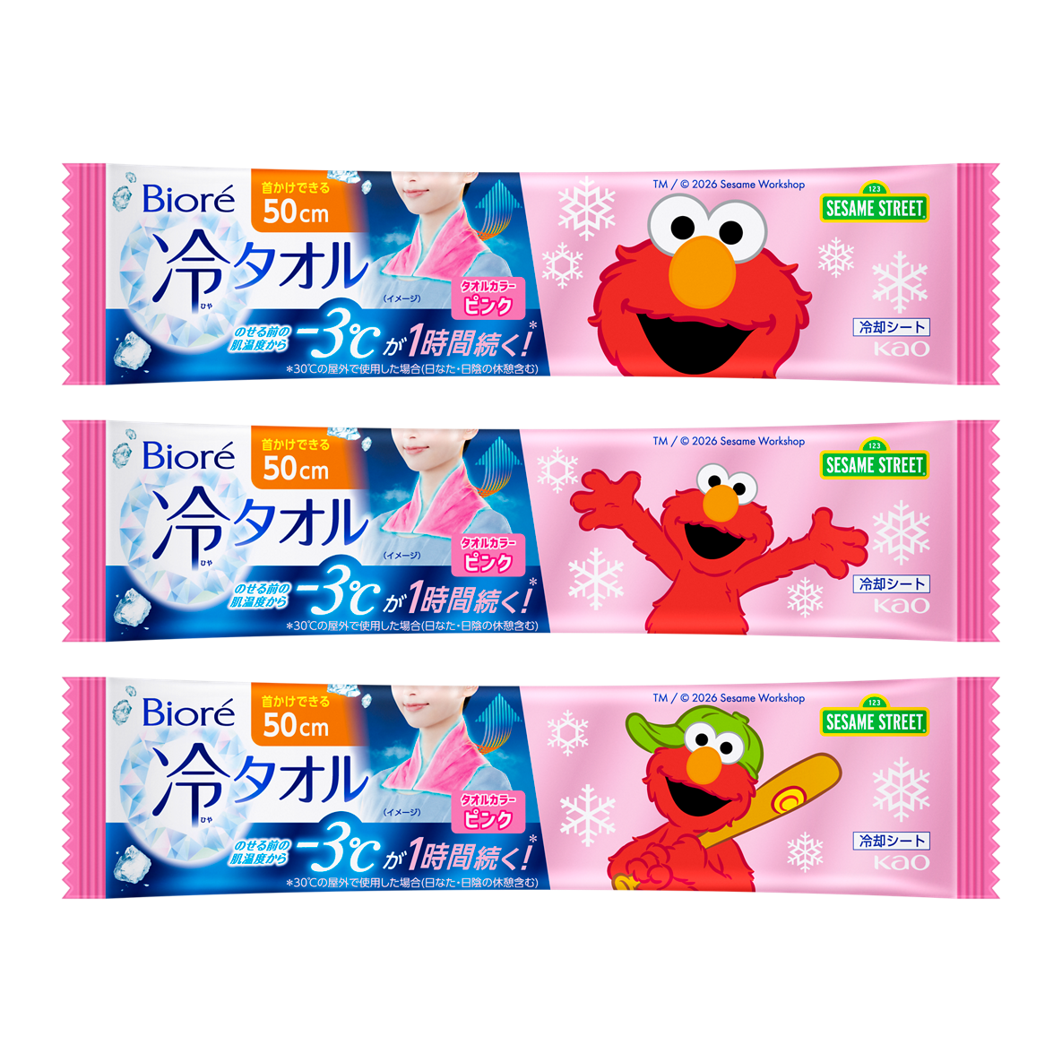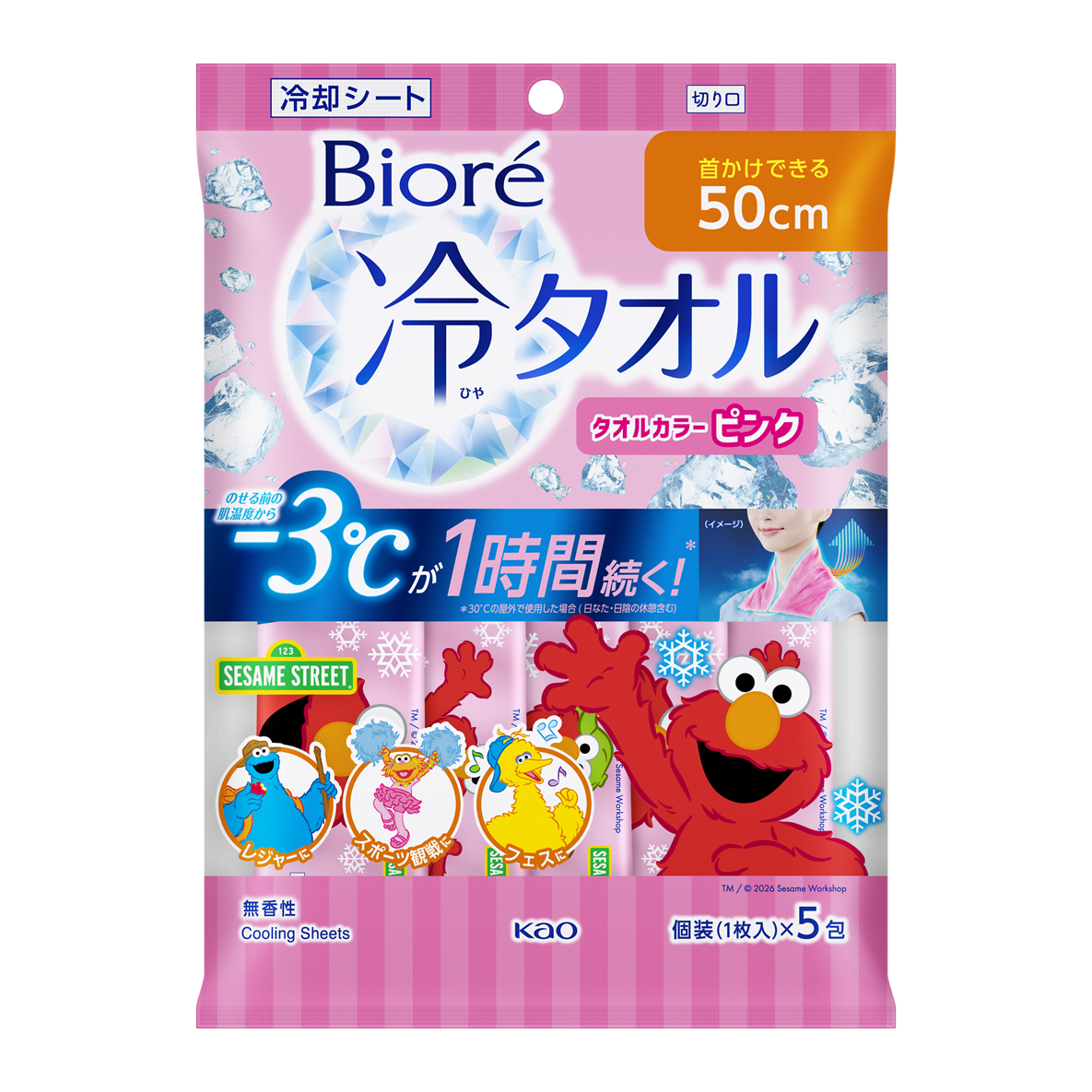 このたび、世界中で愛されている「セサミストリート」をあしらったオリジナルパッケージの「ビオレ 冷タオル」を、2026年3月16日より限定発売します。冷タオルの機能はそのままに、タオルカラーをエルモとクッキーモンスターに合わせたピンクとブルーの2色展開に。オリジナルパッケージの可愛いデザインで用途や気分に合わせて「選ぶ楽しさ」が広がります。