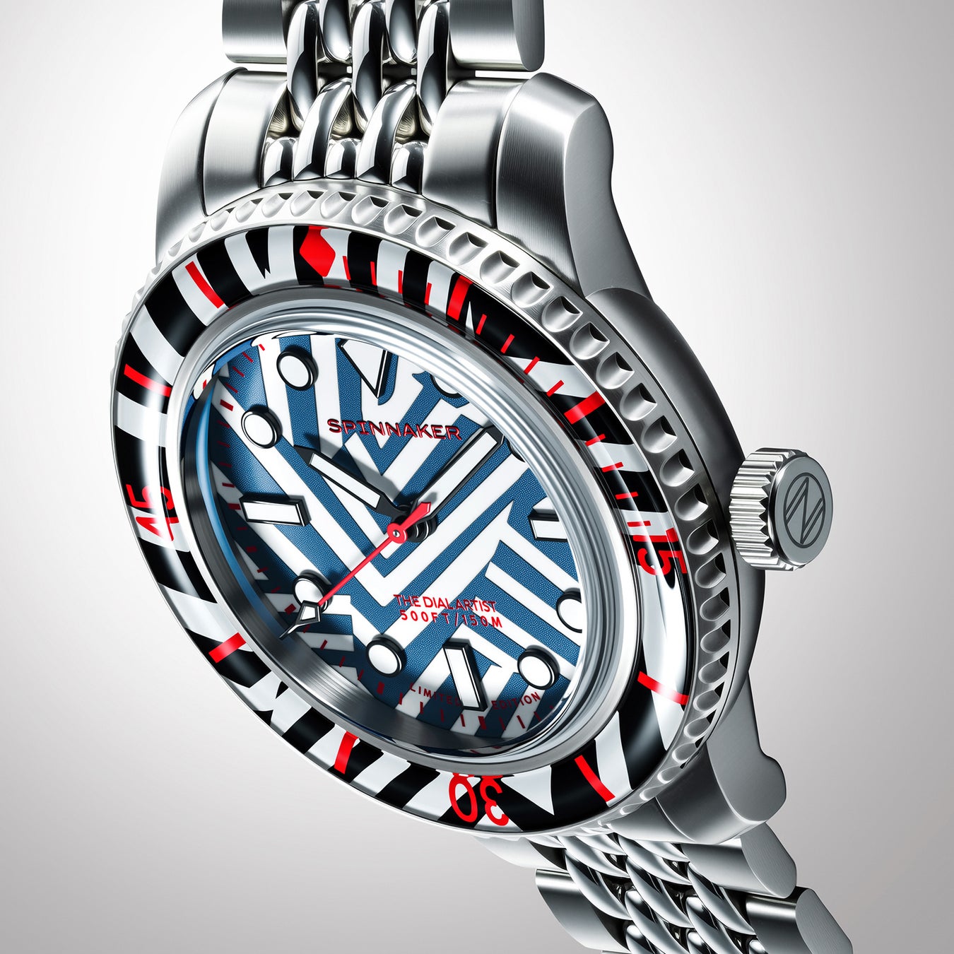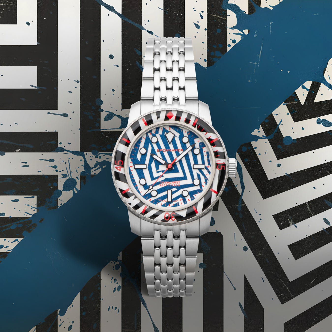 ラズル・ダズル迷彩デザインを採用したこのユニークなコラボレーションは、海洋の創意工夫に敬意を表するとともに、スピニカーのウォッチメイキングとクリス・アレクサンダーの芸術的センスが見事に融合した“身につけられるアート作品”と呼ぶべき一本です。