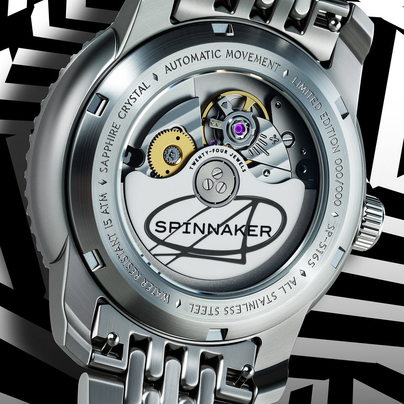 自動巻きの機械式ムーブメントMIYOTA cal.9039を搭載。シースルーになったケースバックから、精密な動きを堪能できます。ローターにはスピニカーのロゴとクリス・アレクサンダーのサインが記され、さらに蓄光塗料によって暗所でほのかな光を灯します。