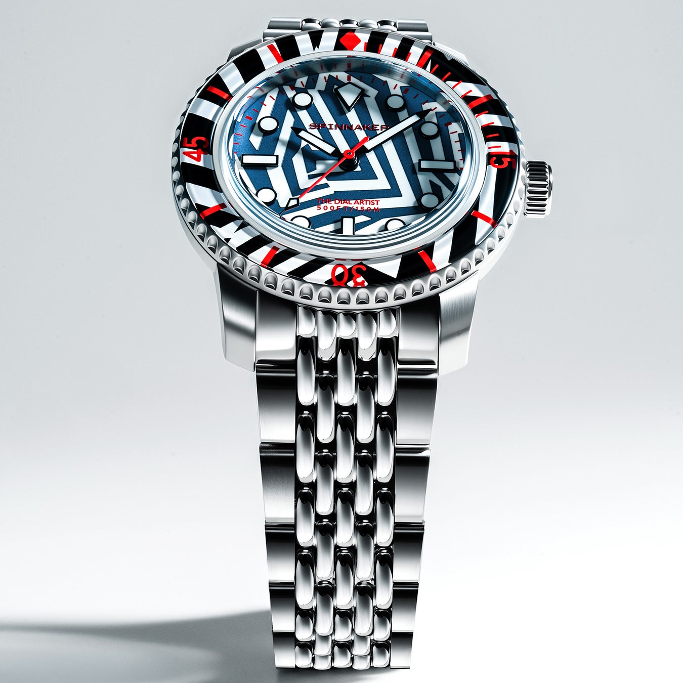 視線を落とすたび、“時間の輪郭”を見失うかもしれません。スピニカーのフルース 40 オートマティック ラズル・ダズル リミテッドエディションはかつてないほど前衛的でトリッキーなパターンにより、見る者を幻惑し、魅了します。英国人アーティストのクリス・アレクサンダーがデザインを手掛けた、500個の限定モデルです。