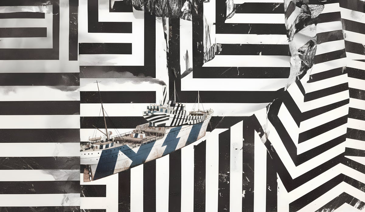 ラズル・ダズルは、主に第一次世界大戦時に船舶用迷彩として使われていました。ハイコントラストかつ幾何学的なストライプやブロックが施すことで、その対象の形状や進行方向、距離感を錯覚させ、敵の攻撃から逃れることを目的としていました。
