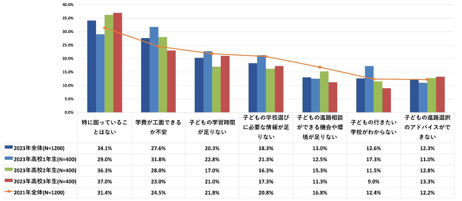 子どもの進路選択や学校選びについて困っていることや悩んでいることについて、「特に困っていることはない」が34.1%と最も多く、次いで「学費が工面できるかどうか不安」が前回比3.1pt増の27.6%たった。