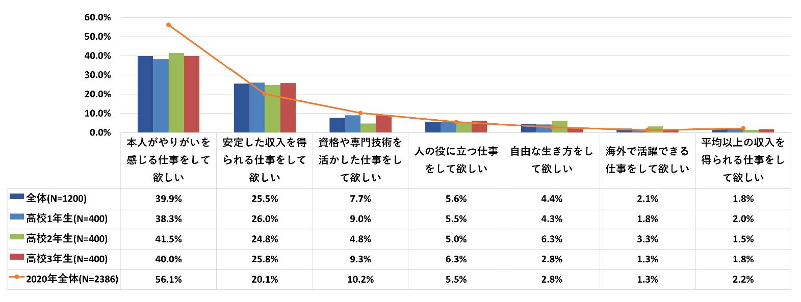 子どもに望む将来の「働く姿」について、「本人がやりがいを感じる仕事をしてほしい」が39.9%と前回(2020年調査)より大幅に減少し、「安定した収入を得られる仕事をしてほしい」が増加【図3】