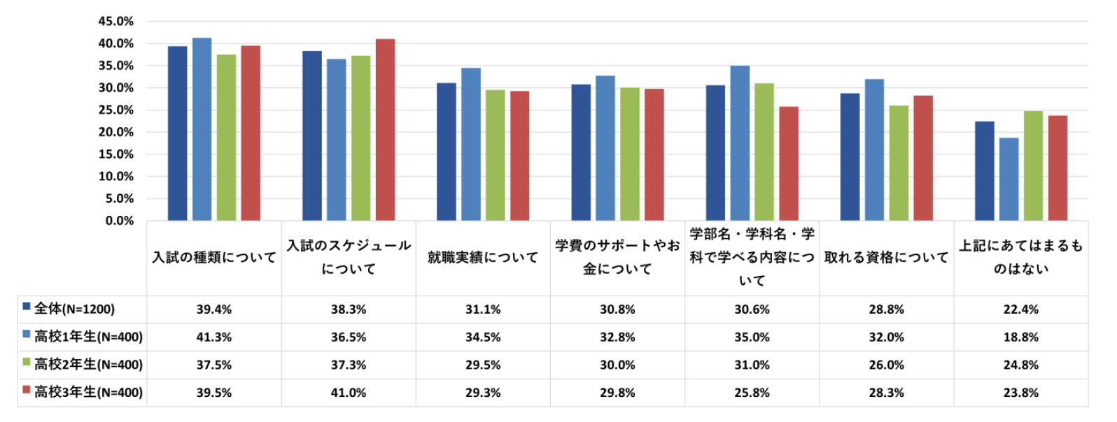 子どもの進路選択・学校選びにあたって保護者がほしい情報は、「入試の種類について」が39.4%、「入試スケジュールについて」が38.3%、「就職実績について」が31.1%だった。そのほか、「学費のサポートやお金について(30.8%)」「学部名・学科名・学科で学べる内容について(30.6%)」「取れる資格について(28.8%)」の回答割合が高かった。【図1】