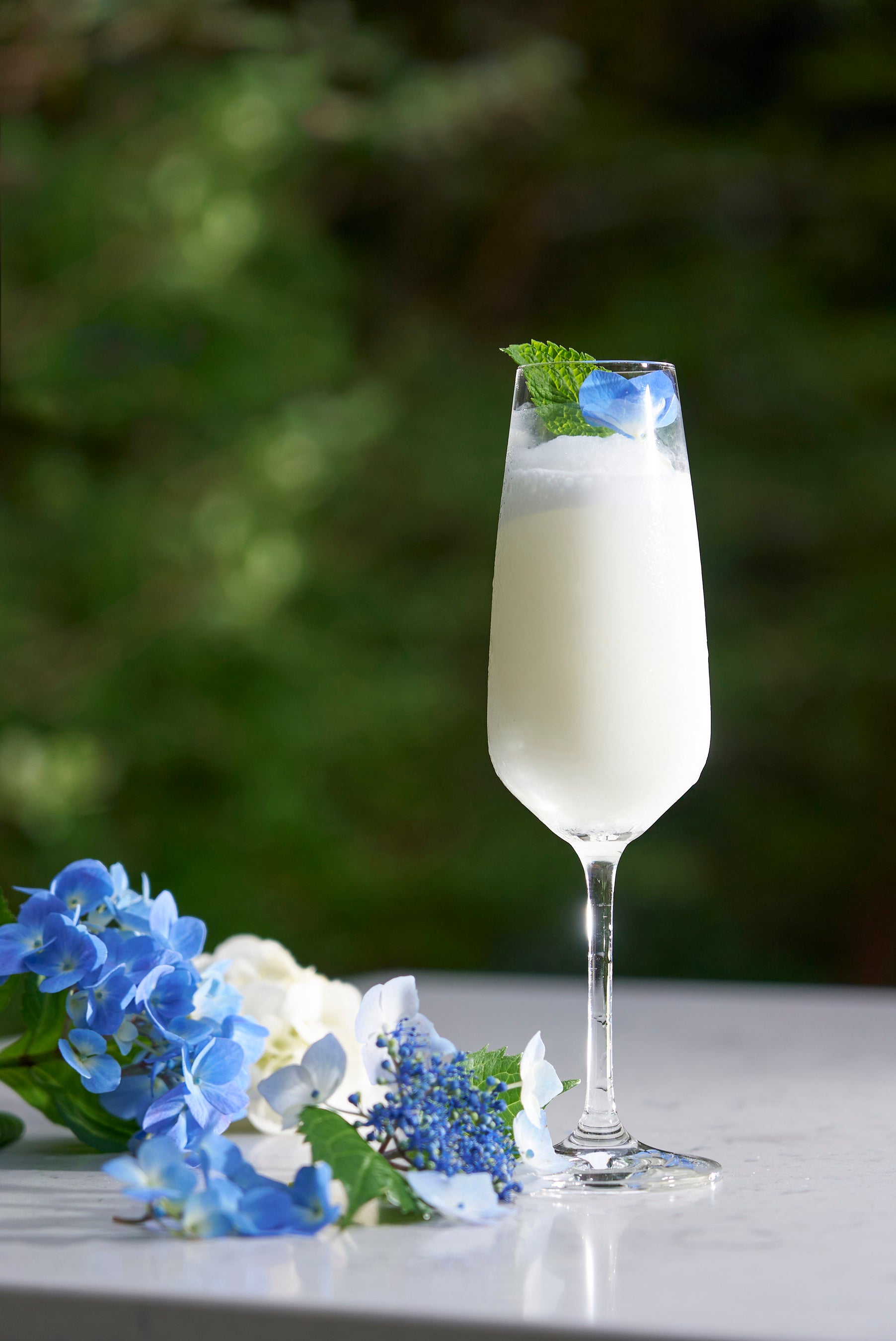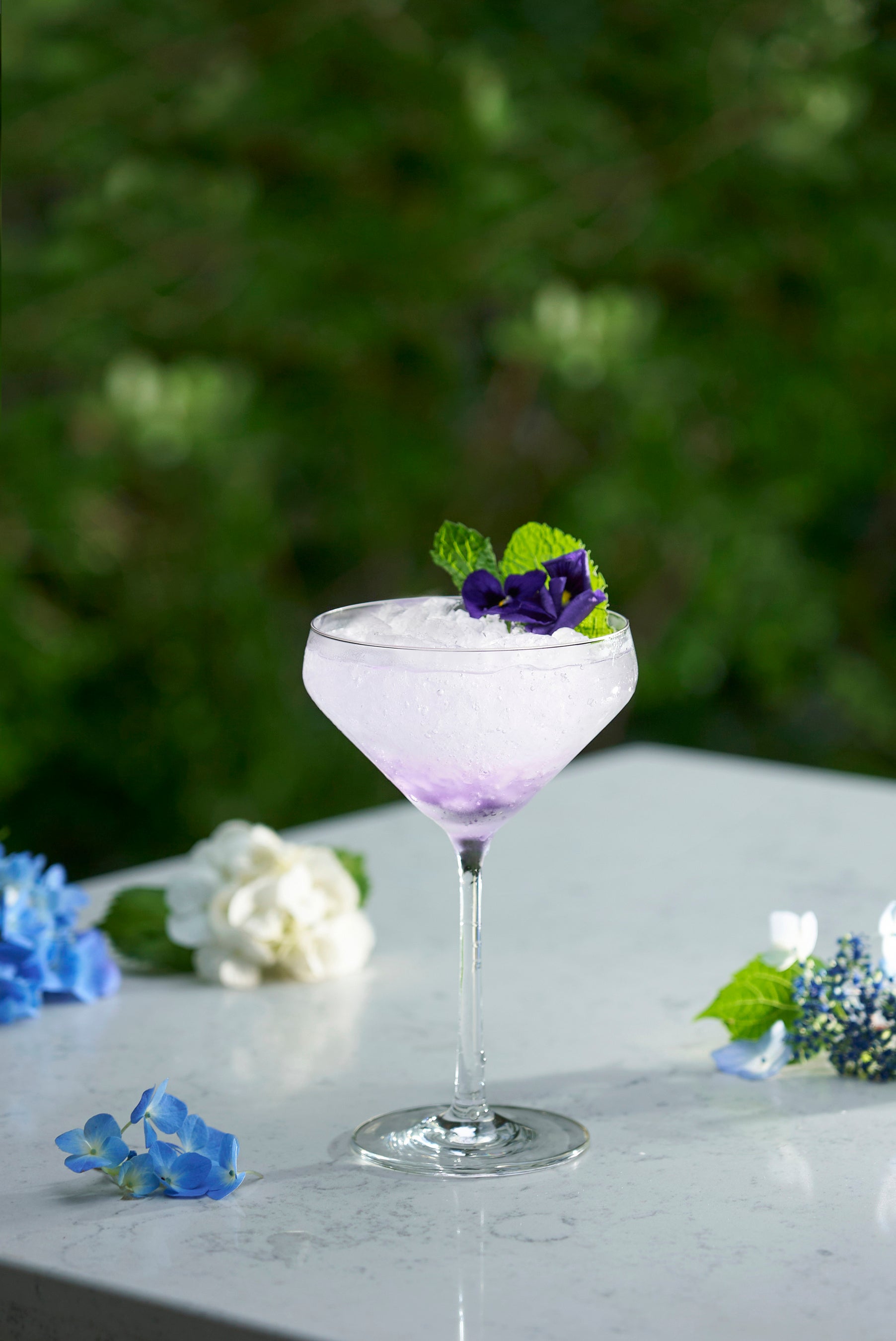 ジンをベースにバラやスミレなどを使用したお花のリキュールを香らせたカクテル。紫のグラデーションで繊細で神秘的な紫陽花を表現しました。