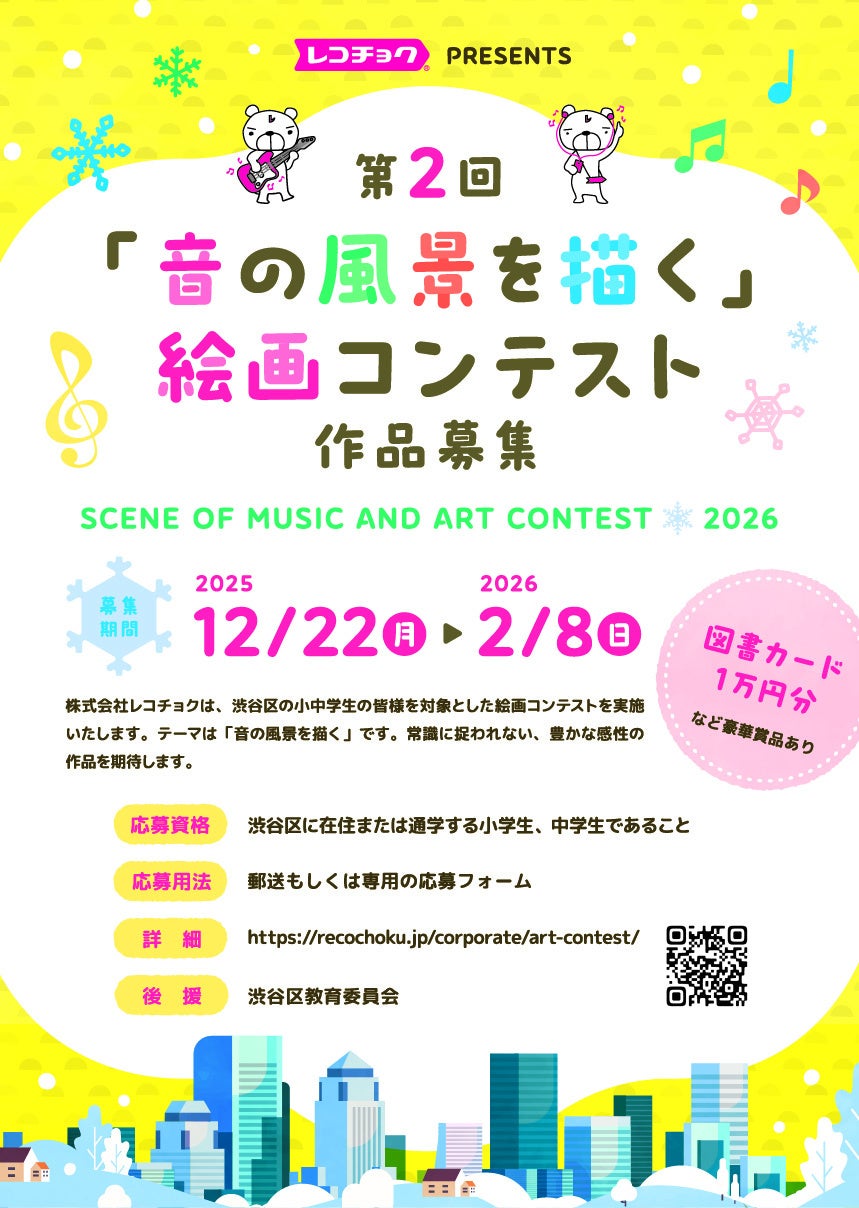 株式会社レコチョク(本社:東京都渋谷区、代表取締役社長:板橋徹、以下「レコチョク」)は、2025年12月22日(月)より、渋谷区教育委員会後援のもと、渋谷区在住・在学の小中学生の皆様を対象とした【第2回「音の風景を描く」絵画コンテスト】の募集を開始いたします。