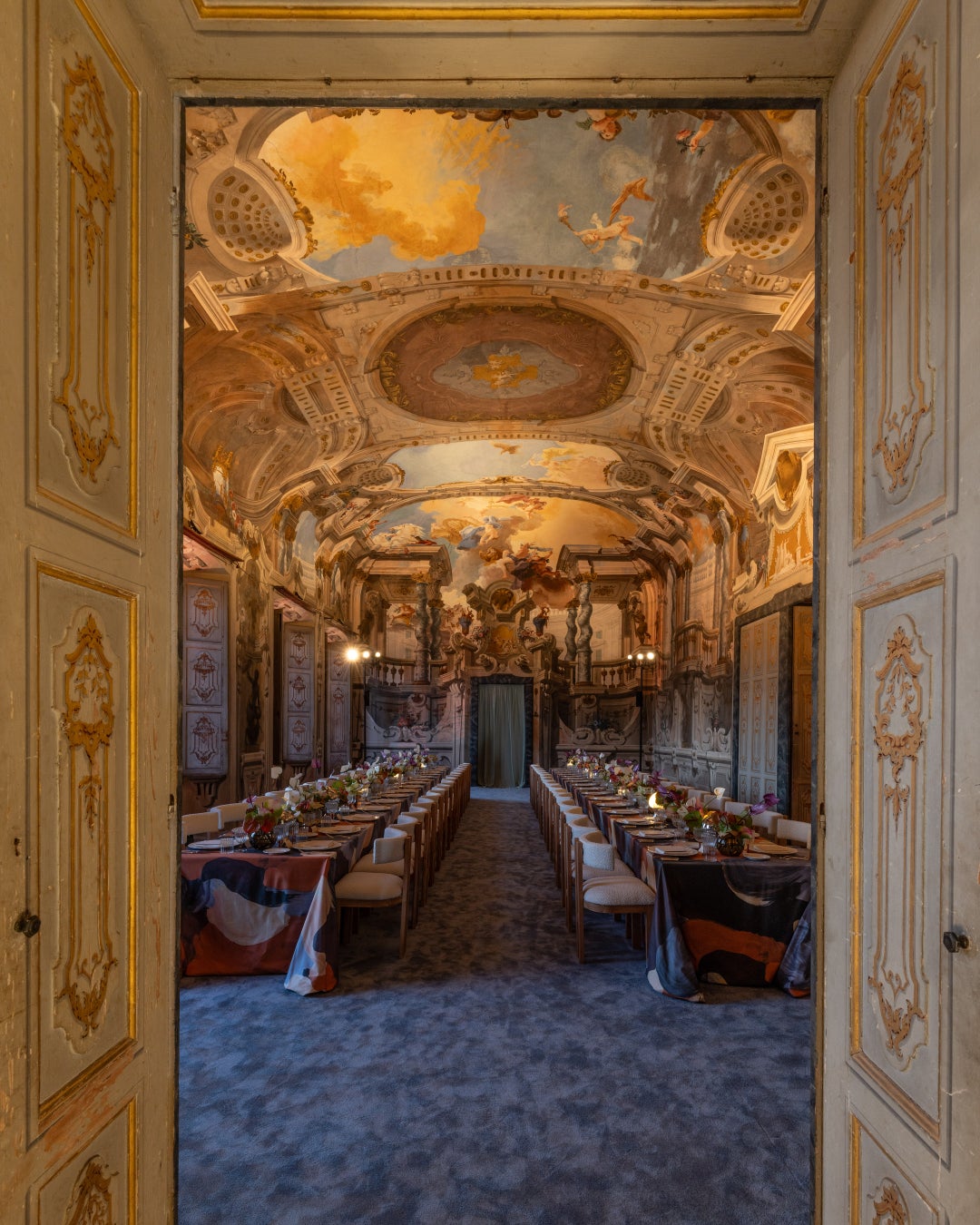 ミシュランの星を獲得したシェフ、ヴィヴィアナ・ヴァレーゼが手掛けたディナーは、エクレティカを形作る三つの芸術言語の世界である「絵画」、「彫刻」、「建築」へとゲストを誘いました。それぞれ異なる空間で展開されたその世界観は、ゲストを深く引き込みました。フレスコ画が施されたサラ・ディ・フェトンテでは、絵画をテーマに、光り輝く色彩が織りなす世界観が生き生きと描かれ、まるでエクレティカが奏でるハーモニーを思わせるようでした。サラ・デル・パエザッジョでは、彫刻をテーマに素材の質感や、形が織りなす躍動感を探求し、手で触れたくなるような質感の対比や、大胆な立体表現が讃えられていました。最後に、豪華なロココ様式のボールルームでは、建築をテーマに、リズムと反射が織りなす空間が作り出されました。アンティークな鏡がボリュームと光を増幅させ、エクレティカの精密な構造を思わせるようでした。