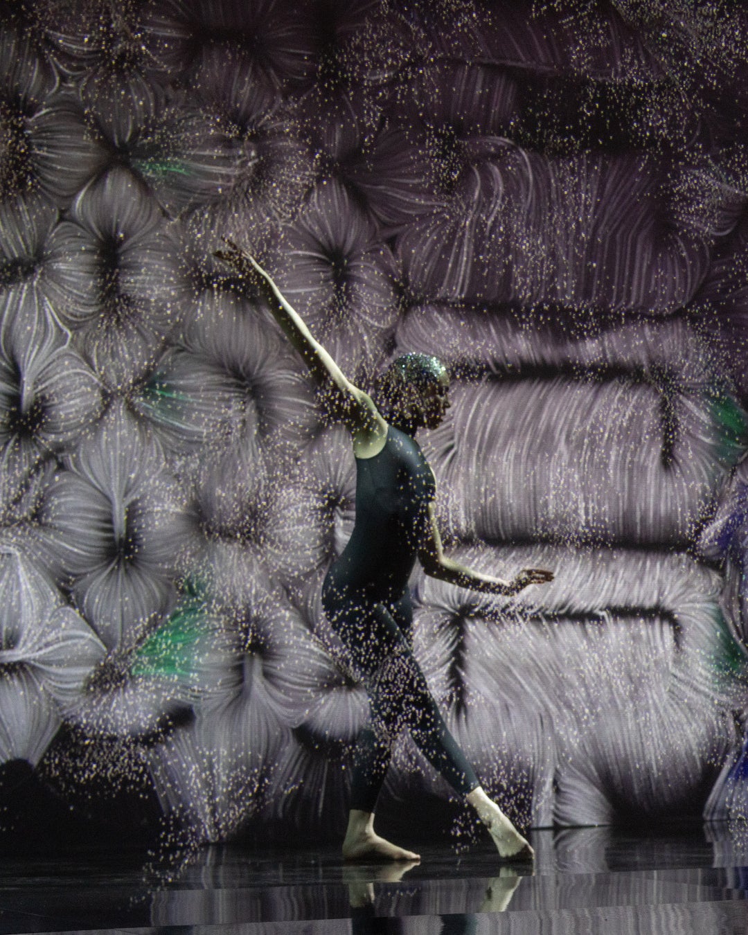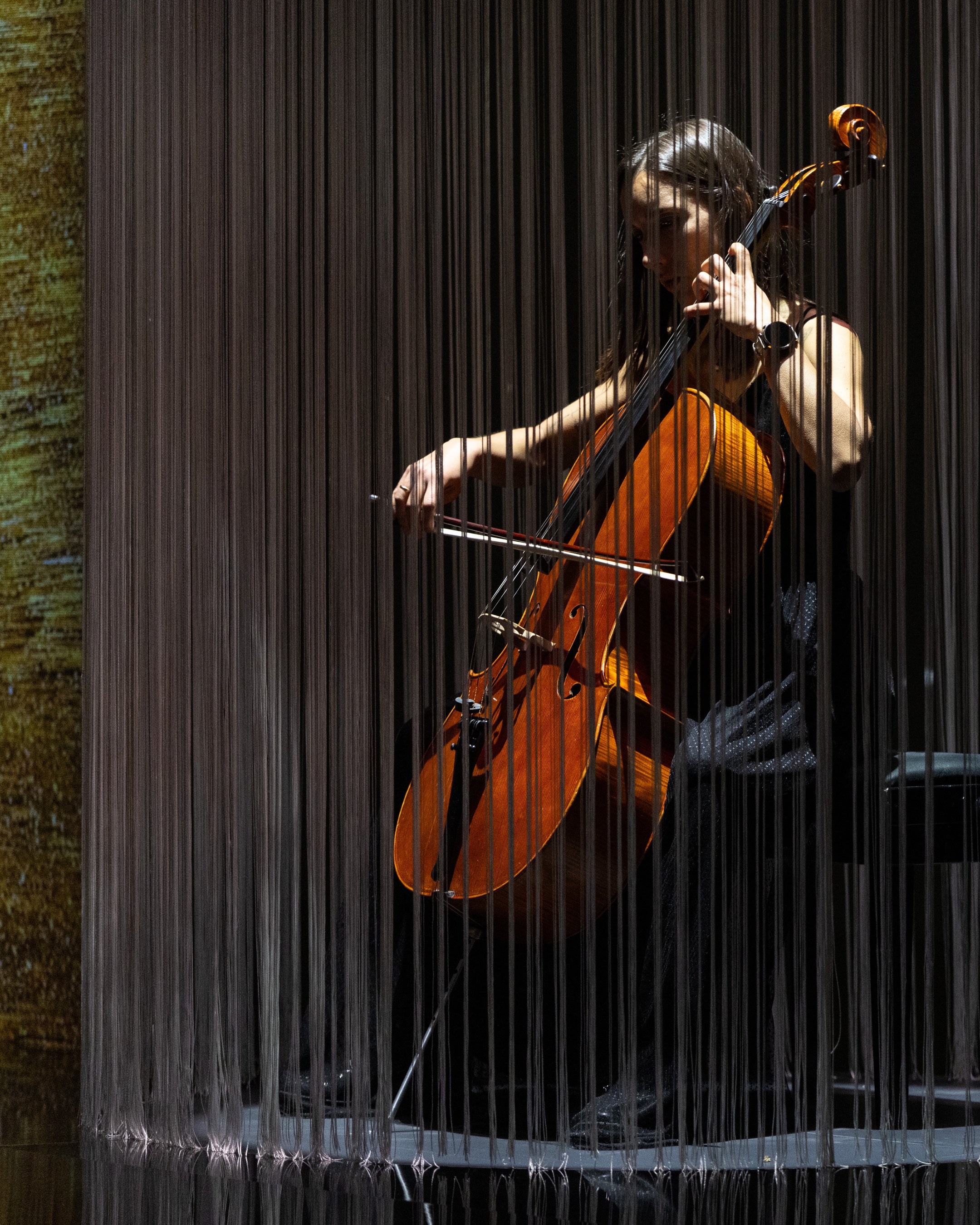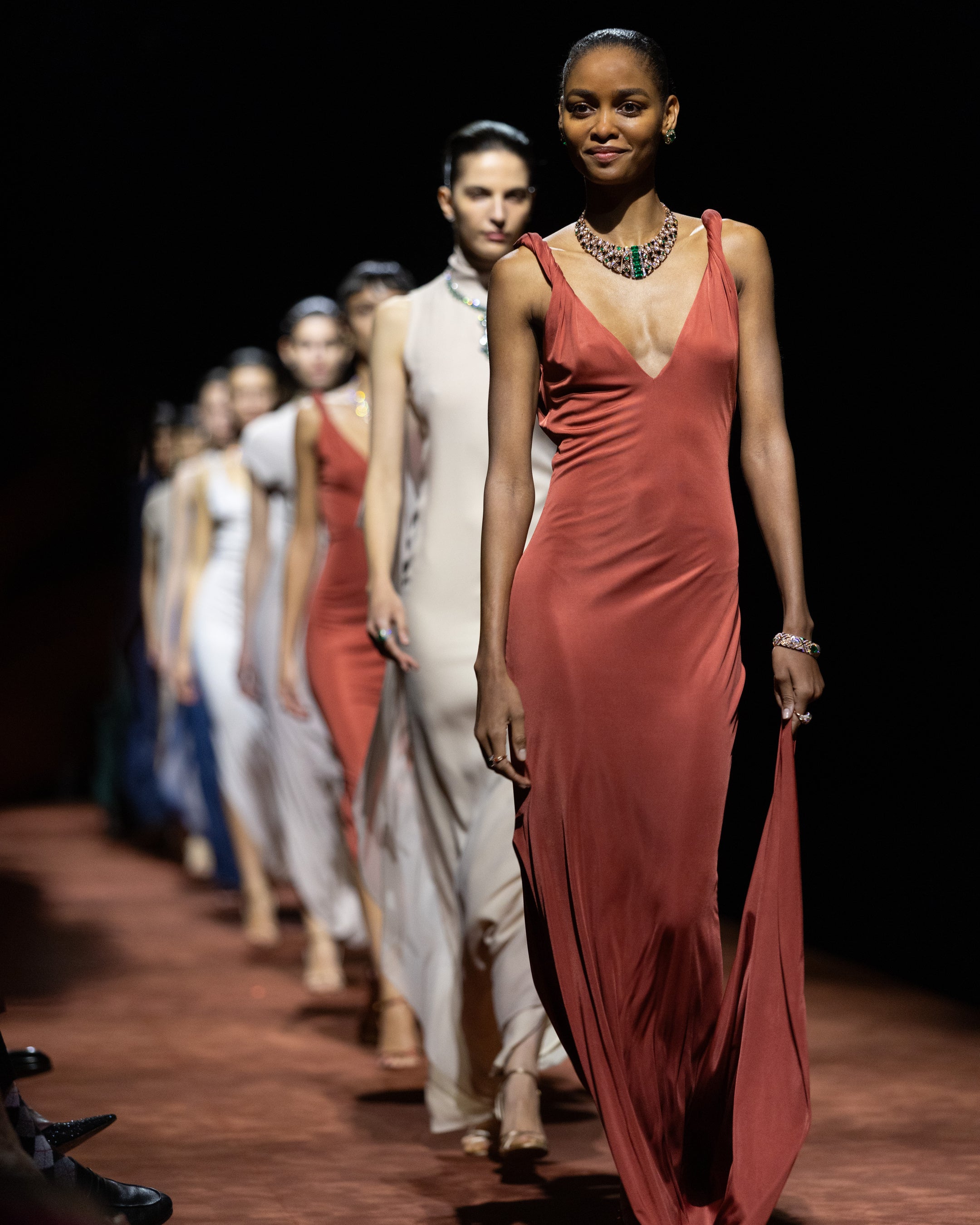 ガラ ディナーの後は、壮大なショーパフォーマンスで最高潮に達し、エクレティカの核となる3つの芸術言語を統合した体験を提供しました。空間には、記念碑的なローマ風の光の柱が彫刻的な存在として現れ、同時に建築構造物であり、光り輝くトーテムでもありました。これらの垂直なフォルムの中で、音楽家たちがクラシックな楽曲を演奏し、そのシルエットは影絵として投影され、古代ローマ彫刻の時代を超えた重厚さを喚起しました。そして、エクレティカの作品を身につけ、新進気鋭のイタリア人ファッションデザイナー、フランチェスコ・ムラーノによる特注ドレスを身につけたモデルたちが、この演出空間を彩りました。光り輝く光線が空間に正確な幾何学模様を描き出し、デジタルアートスタジオfused*とのコラボレーションで考案された没入型プロジェクションの多層システムは、二層に重なるような奥行きのある映像が投影され、空間の広がりや動きがより鮮やかに感じられました。ヴィラの壁には、ブルガリのジュエリーを拡大したアート作品が、アーティストの手で色彩豊かな風景へと再構築され、次々と映し出されました。まるで壁自体が生きているかのようなキャンバスと化したのです。