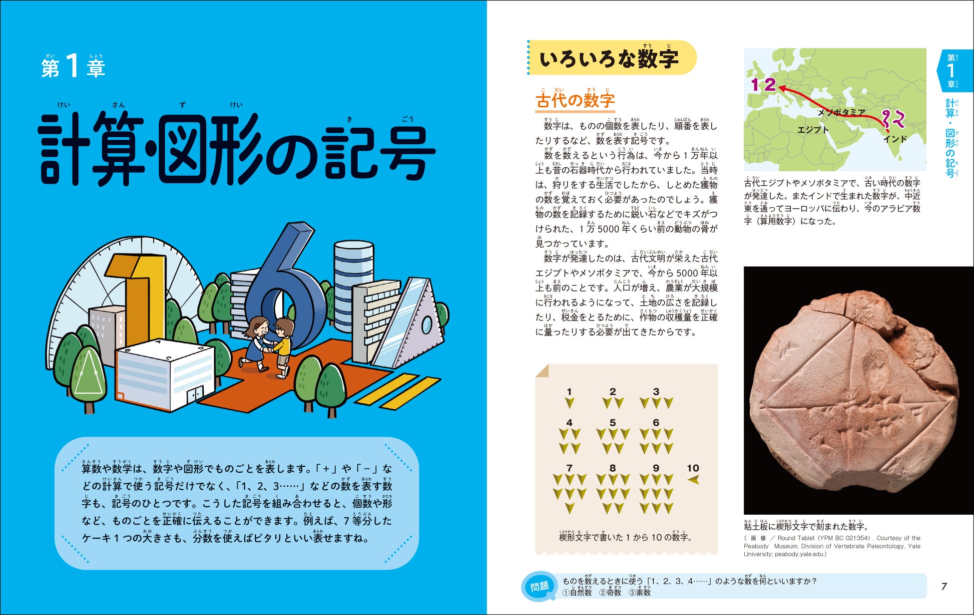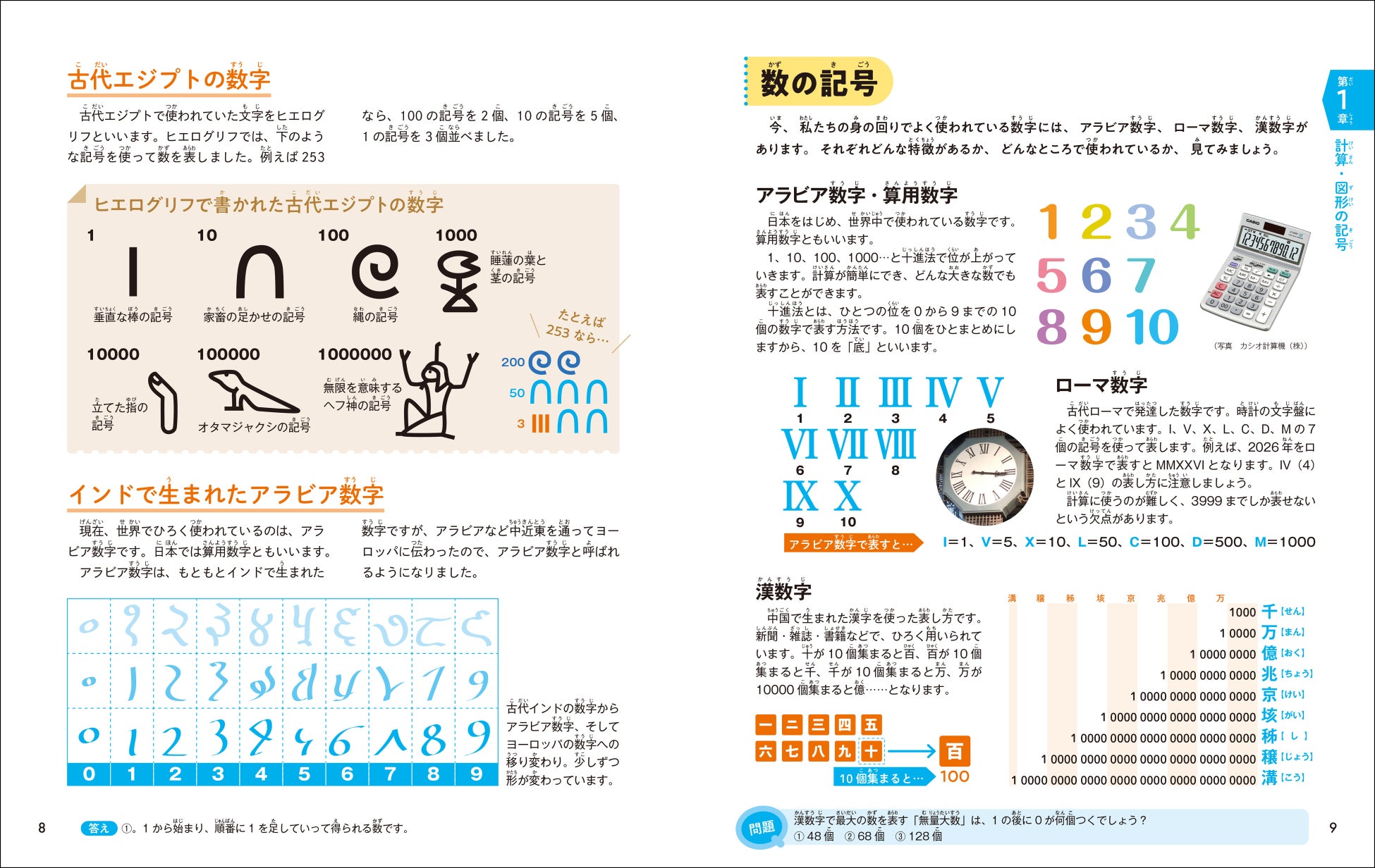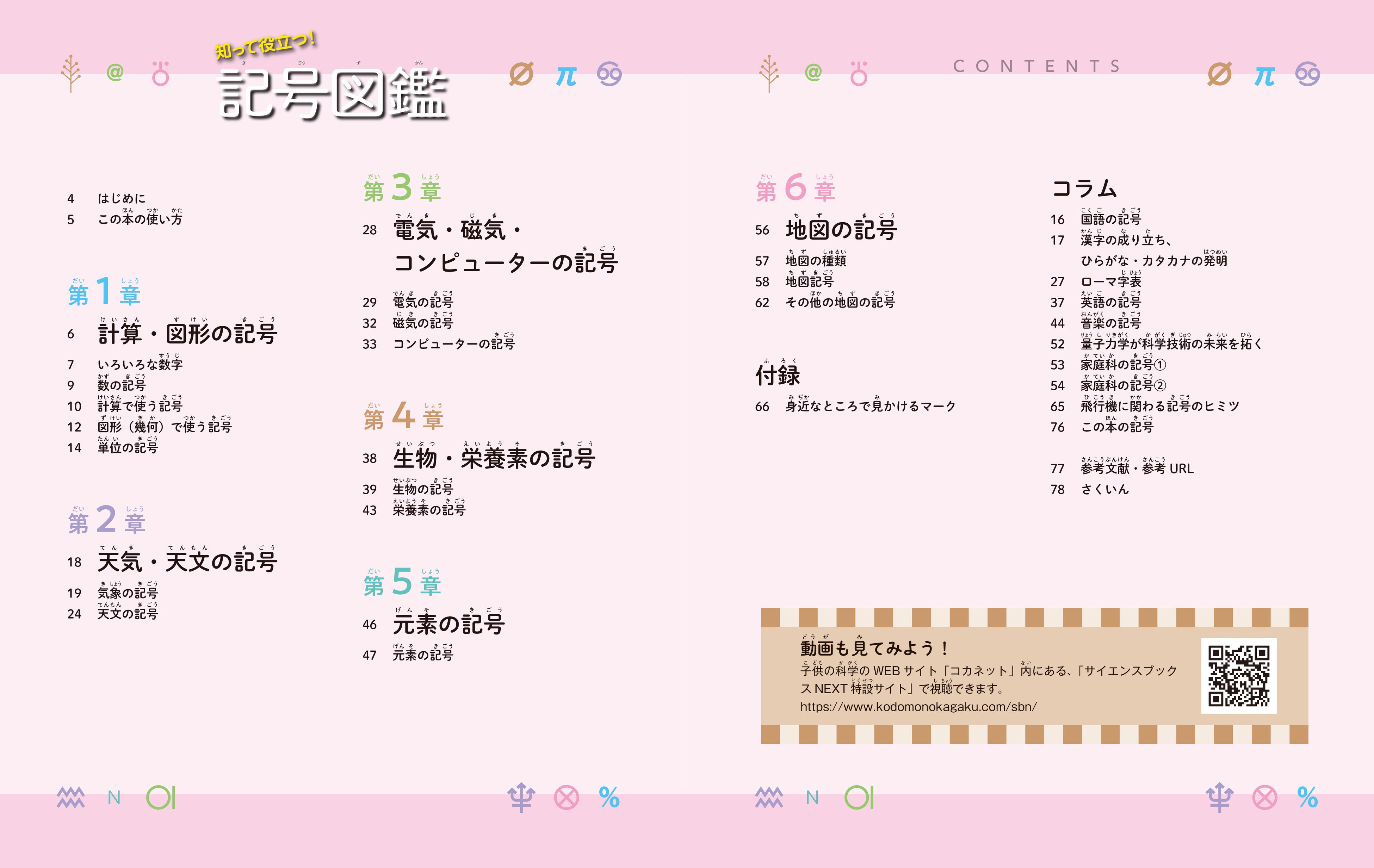 本書では、数や図形、天気や天文、電気やコンピューター、元素、地図などの教科書に出てくる科学の記号から家の中や街角で見かける道路標識や製品マークまでさまざまな記号やマークが大集合。