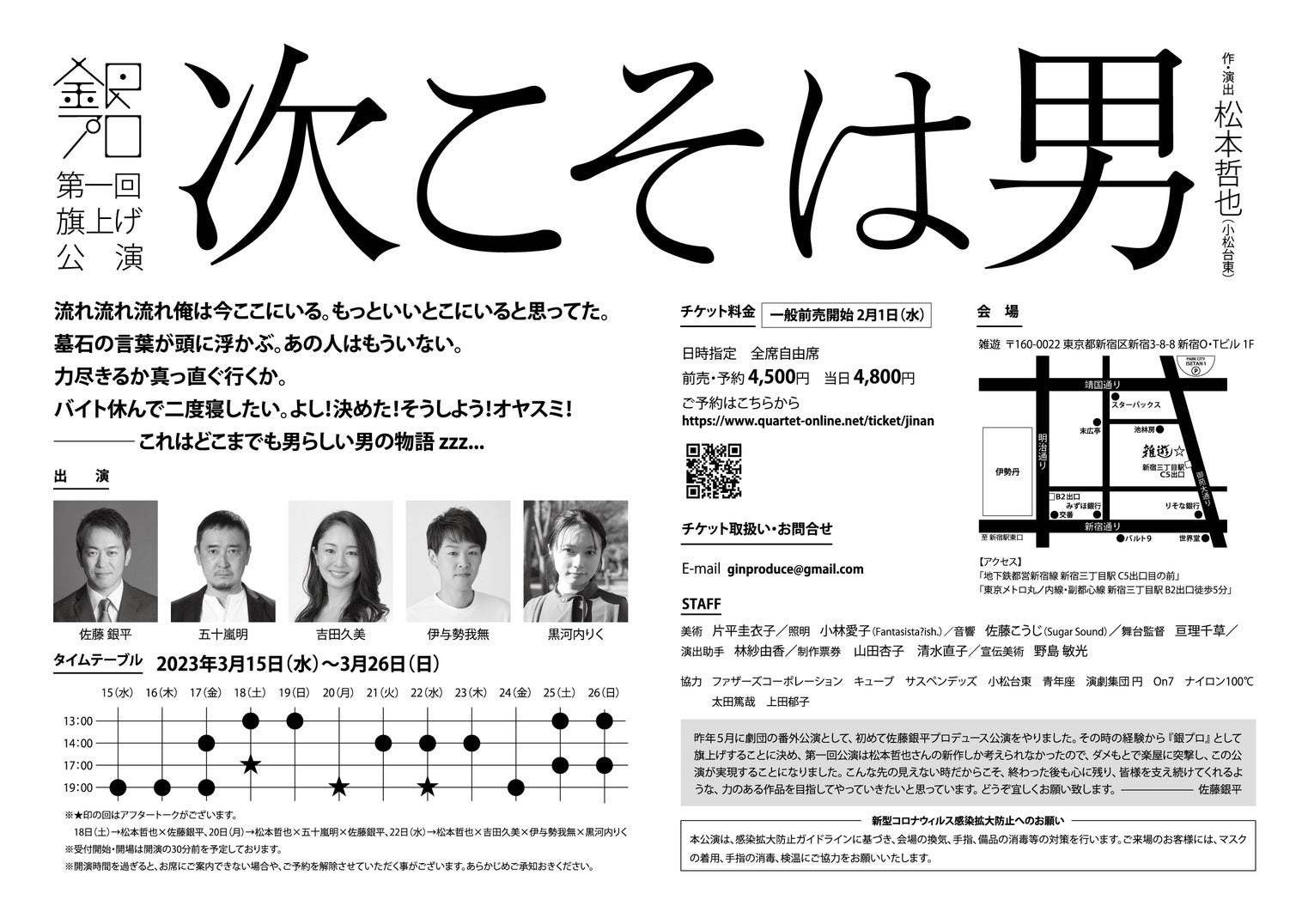 佐藤銀平プロデュース 銀プロ第一回旗揚げ公演『次こそは男』が2023年2月15日 (水) ~2023年3月26日 (日)に雑遊(東京都新宿区新宿3-8-8新宿O・Tビル1F)にて上演されます。