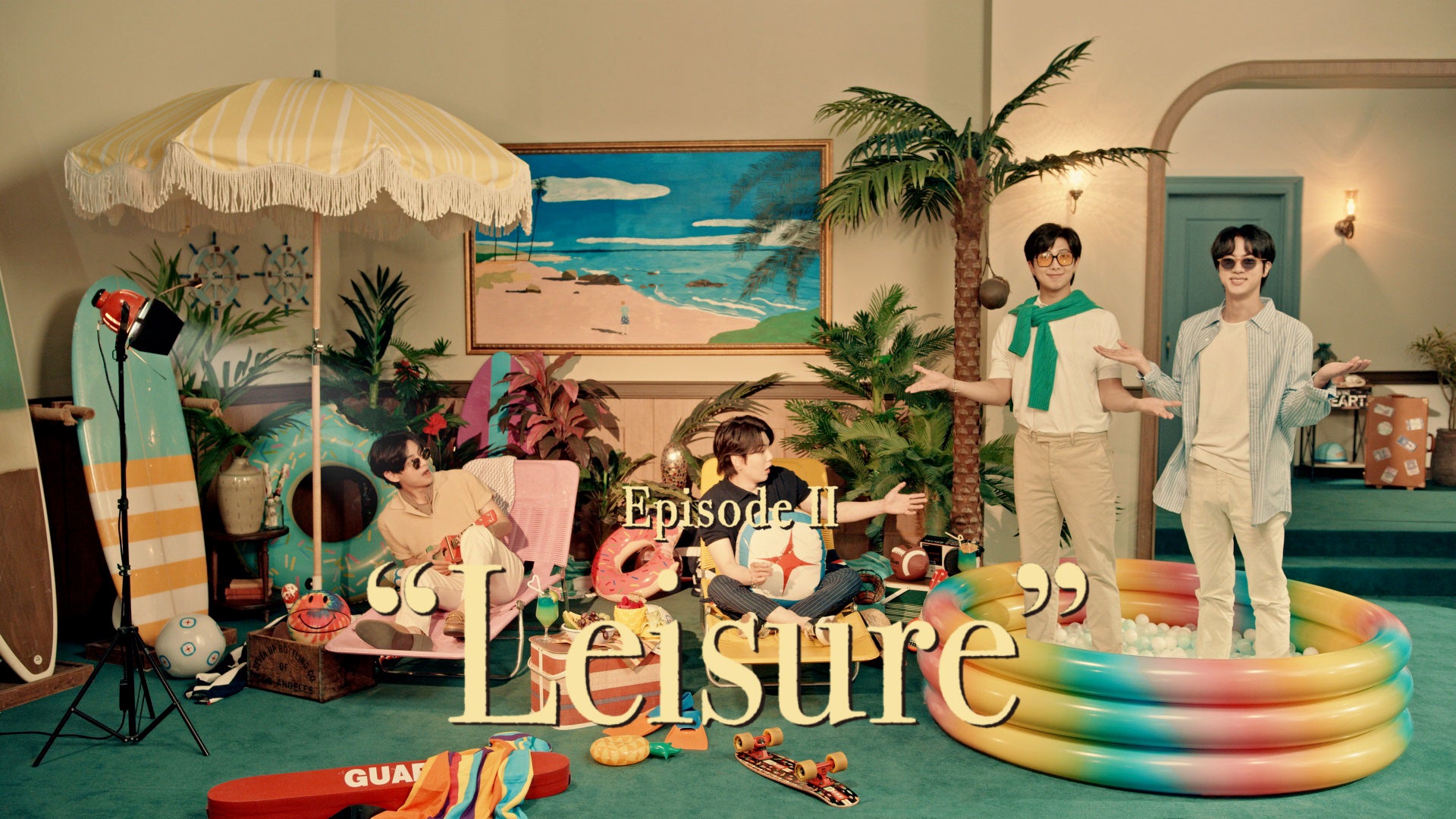 RMとJINがリビングに入ると、部屋の一角にビーチパラソルやビーチチェア、浮き輪などを広げ、壁には巨大な海の絵を掲げ、夏気分を満喫しているSUGAとVがいました。そんな散らかった空間で楽しんでいる様子に呆れたRMとJINは、厳しい表情。昨年の「Smile Cleaning篇」に引き続き、また怒られる!とSUGAとVが思った矢先、RMとJINはキシリトールガムを噛んで笑顔をみせます。すると魔法がかかり、ふたりの目元にはサングラスが、そして足元にはボールプールが出現!リビングが更に夏模様に。SUGAとVが驚いていると反対側から聞き慣れない動物の鳴き声が。顔を向けると、J-HOPE、JIMIN、そしてJUNG KOOKが夏らしいグッズを手に、巨大なオウムとの記念撮影を楽しんでいるのでした。