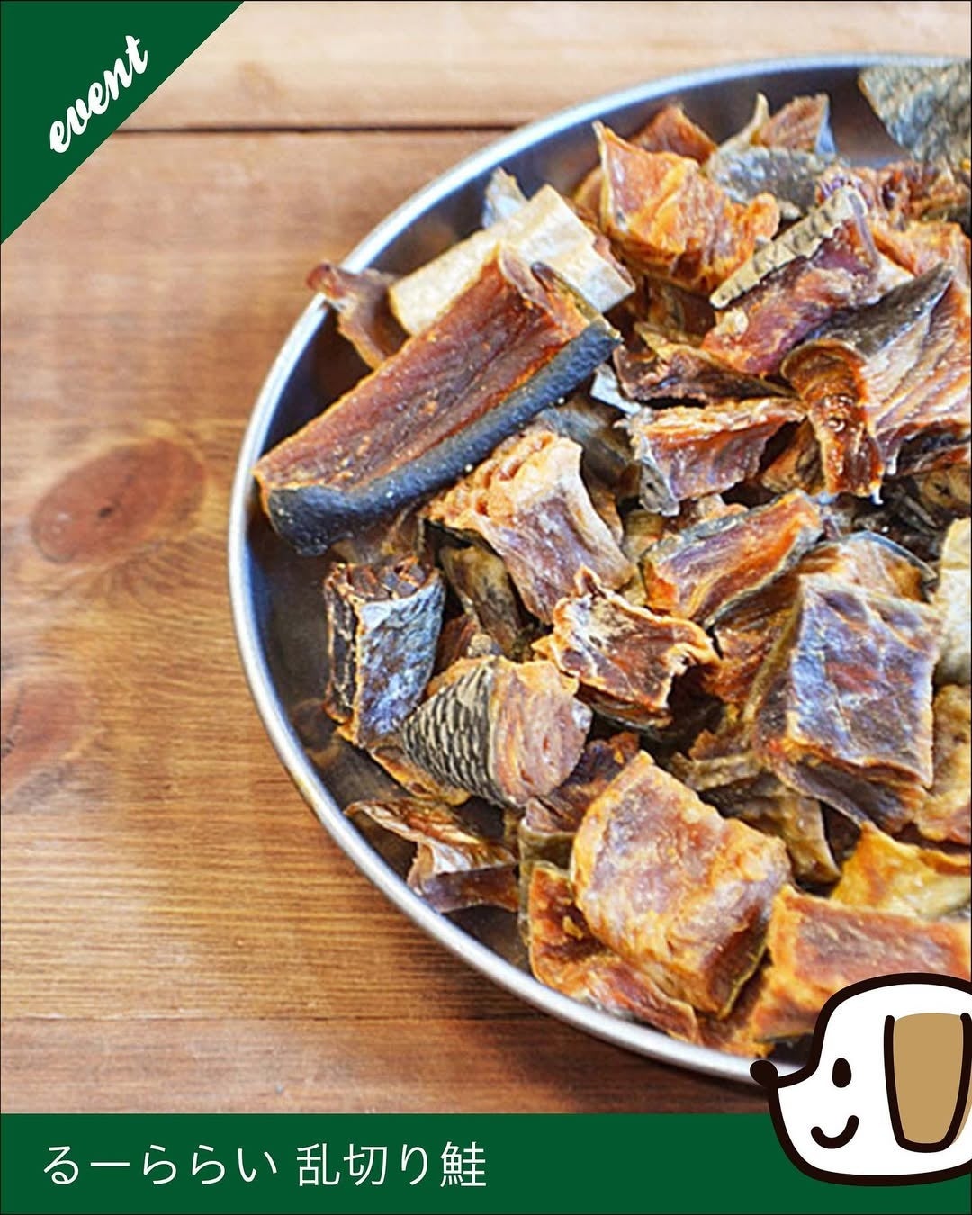 サンタやトナカイなどクリスマスコスチュームで遊びに来てくれたワンちゃんに、柏の葉T-SITEから感謝の気持ちを込めて、るーららいの「乱切り鮭」をプレゼントします。