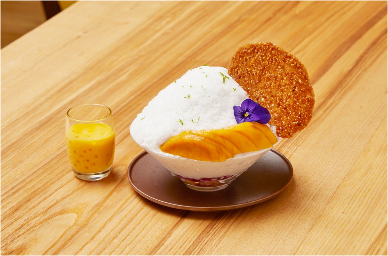 夏の喫水線では、完熟マンゴーを贅沢に使用した「和のトロピカルかき氷」をご提供いたします。特製のココナッツフレーバーの氷の下にはフレッシュなドラゴンフルーツとキウイ、マンゴーを忍ばせ、食べ進めるほどにフルーツの様々な食感と味わいが楽しめます。タピオカを入れた濃厚なコクと甘みの特製「マンゴー練乳とタピオカソース」を添えてご提供いたします。トップに乗せた国産マンゴーと自家製ココナッツチュイルのサクサクした食感を併せてお楽しみください。