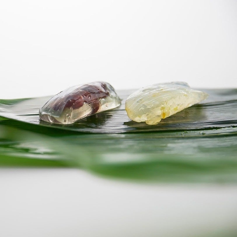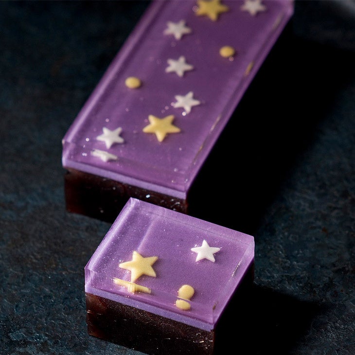 夏の夜に輝く星を透きとおる琥珀羹にとじこめ、風味豊かな小倉羹と合わせた二層羊羹。