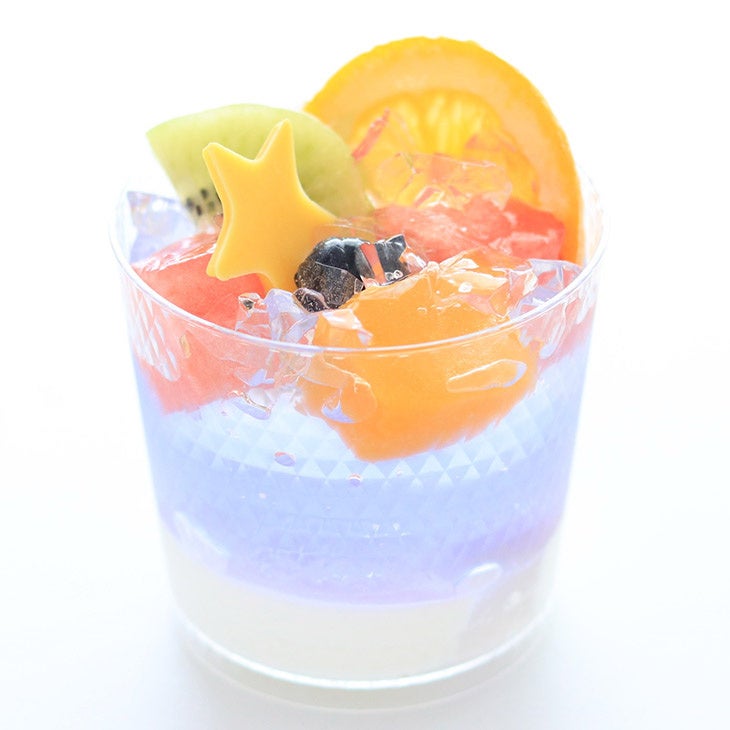 ヨーグルトムースと、ブルーハーブシロップのゼリーの上に、フルーツと星型のチョコレートをトッピング。