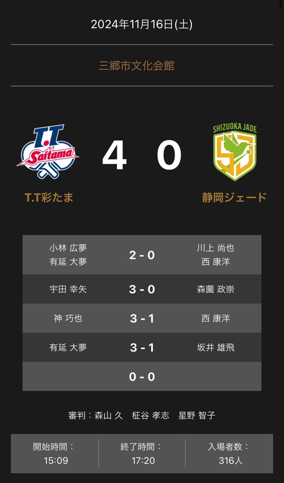 ノジマTリーグ 2024-2025シーズン 公式戦 11月16日開催 T.T彩たま vs 静岡ジェード 試合結果