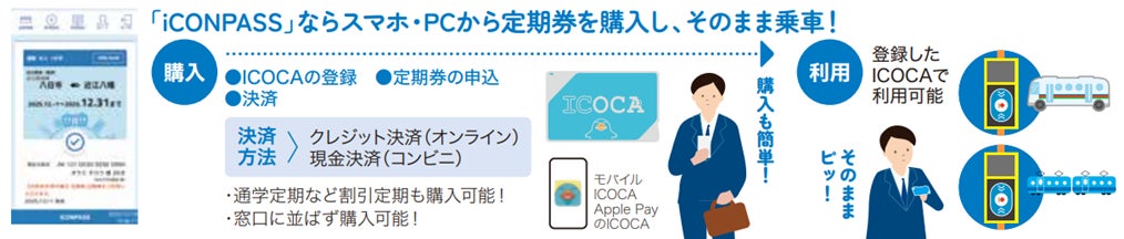 ICOCA Web定期券サービス「iCONPASS」で近江鉄道線の駅に行かなくても定期券を購入いただけます。また、「近江鉄道線と近江バス・湖国バス」「近江鉄道線と近江バス・湖国バス+JR線」など、複数の定期券が1枚のICOCAでご利用いただけます。
