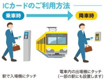 定期券区間内では、乗車時と降車時に各駅または、電車内に設置している入出場機にタッチすることでご乗車いただけます。