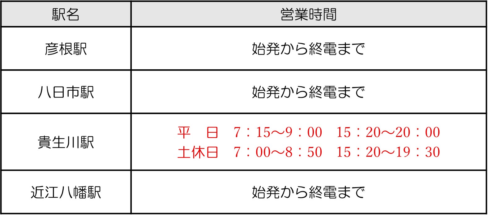 ICOCAの購入、近江鉄道線ICOCA定期券の購入・払いもどし・チャージは、近江鉄道線の駅窓口(彦根駅・八日市駅・貴生川駅・近江八幡駅)で取扱います。