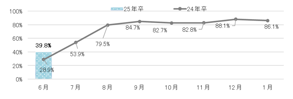 2025年卒の学生に6月時点でインターンシップ仕事体験への参加経験を聞いたところ、累積参加率は前年比10.9pt増の39.8%で、6月単月の参加率は前年比2.5pt増の26.5%だった。インターンシップ・仕事体験に対する関心は年々高まっていたが、2025年卒からはインターンシップの定義が改正されることもあり、特に早いタイミングで学生の関心を集めたと思われる。【図1、2】