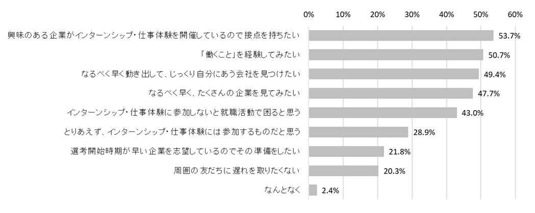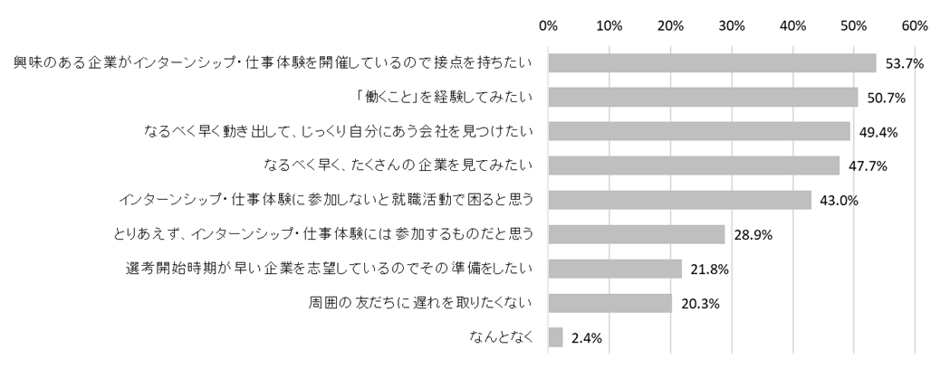 インターンシップ・仕事体験に参加する際の心境として、「興味のある企業がインターンシップ・仕事体験を開催しているので接点を持ちたい」が最多で53.7%、次いで「『働くこと』を経験してみたい」が50.7%だった。就職活動を意識して企業との接点をもつことも重視しているが、就業体験そのものにも価値を感じている様子がうかがえる。一方で「とりあえず、インターンシップ・仕事体験には参加するものだと思う(28.9%)」や「周囲の友だちに遅れを取りたくない(20.3%)」といった心境の学生が一定の割合いることもわかった。【図5】