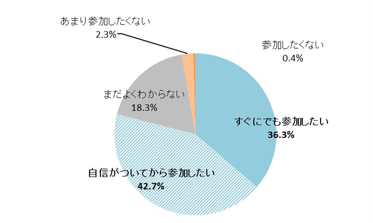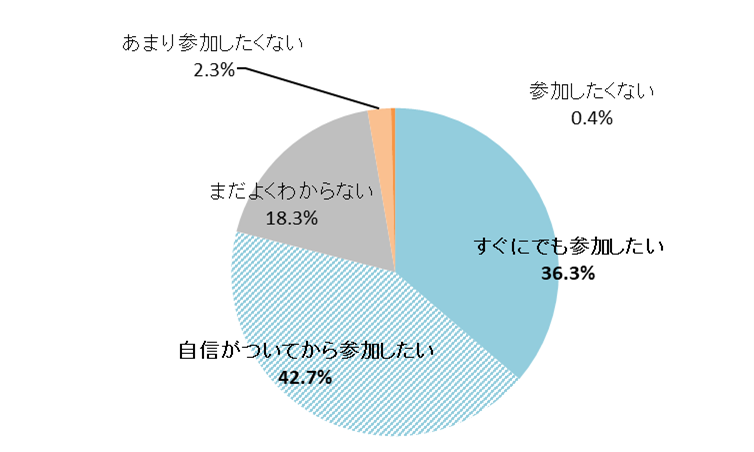 インターンシップに参加した学生の情報を採用選考に利用するプログラムに参加したいと思うか聞いたところ、「自信がついてから参加したい」が最多で42.7%、次いで、「すぐにでも参加したい」が36.3%で、合計すると8割近くの学生が参加したいと回答した。「まだよくわからない」という回答も18.3%あったが、いずれは参加したいと前向きに捉えている学生が多いようだ。【図4】