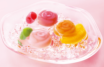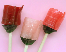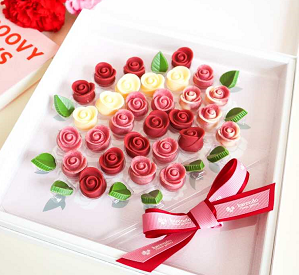 赤色はいちご味で花言葉"愛情"、薄ピンクは杏仁味で"誇り"、濃ピンクはライチ味で花言葉"感謝"