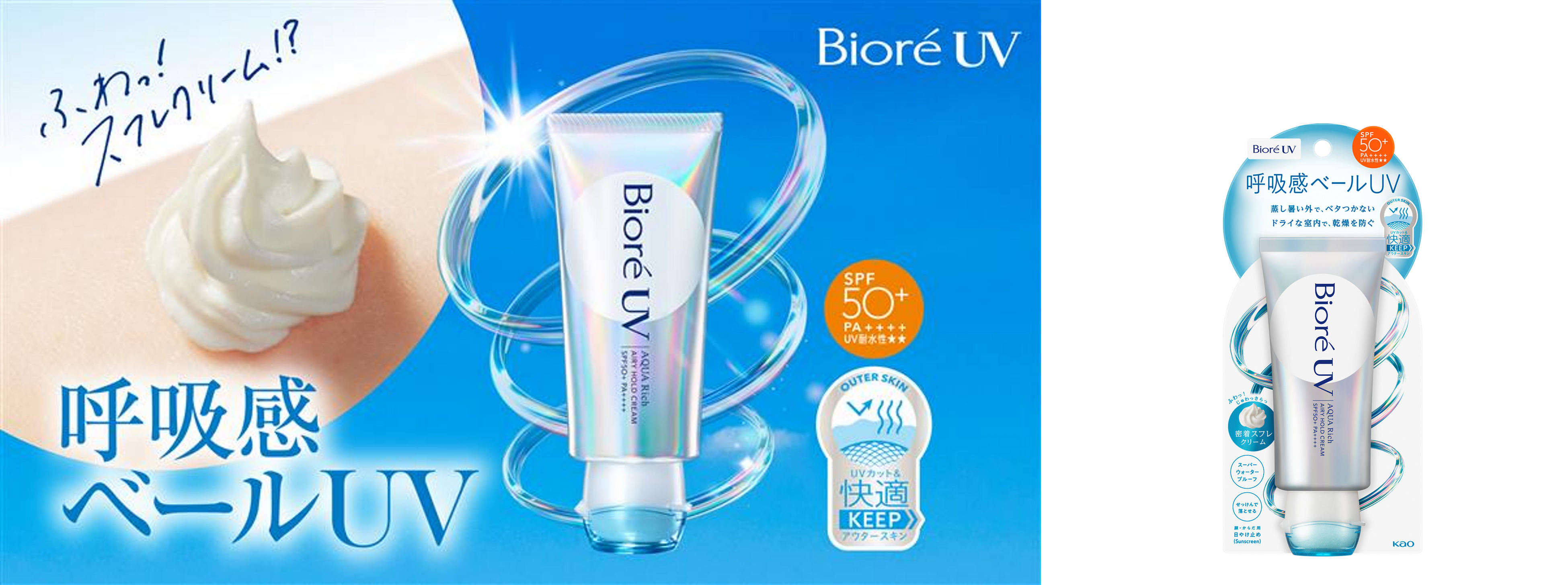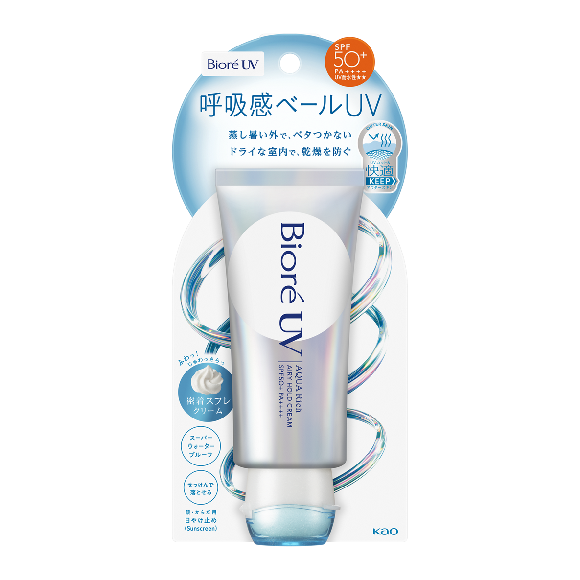 『ビオレUV アクアリッチ エアリーホールドクリーム』(通称:呼吸感ベールUV)は、UVカット&快適KEEPアウタースキンを採用。高い紫外線防御効果に加えて、湿度に応じて水分を吸放出することで、膜の厚みが変化し肌表面を快適にし続けます。蒸し暑い外でベタつかず、ドライな室内で乾燥を防ぐ日やけ止めの新価値提案により、使用したお客さまの89%が使用感のよさからまた使いたいと回答*5。「蒸し暑い場所でも、エアコンが効いた部屋でも、肌のベタつきを感じず快適に過ごせた」など、つけた瞬間から日中まで続く快適な使い心地に大変好評の声をいただいています。