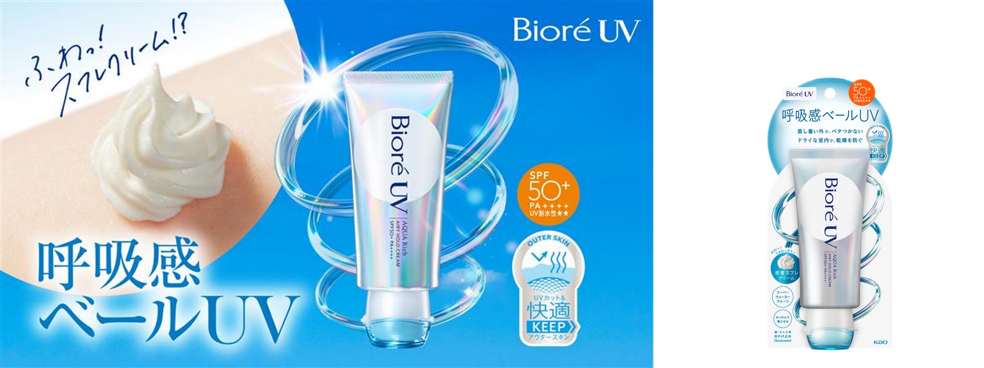『ビオレUV アクアリッチ エアリーホールドクリーム』(通称:呼吸感ベールUV)は、思わずたっぷり塗りたくなる快適な使い心地を追求した日やけ止めです。「出したときは“ふわっ”、塗り広げるときは“じゅわっ”と肌になじんでいく密着スフレクリームで、思わずたっぷりと肌に塗りたくなる」といった使用感が評価され、新感触のテクスチャーとして話題を集めました。また乾燥している春先でも使いやすい点が支持され、使用者の拡大につながったと考えられます。