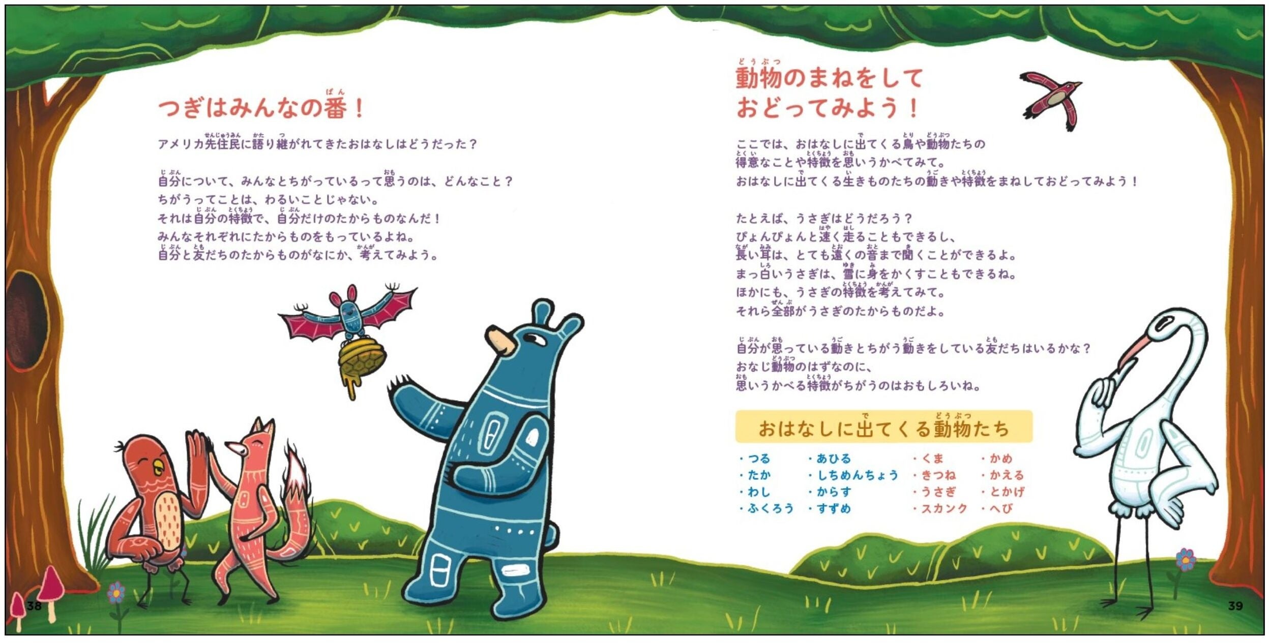 おはなしの後には、子どもたちがおはなしの学びを自分事にできるアウトプットページがあります。自分や友達の「ちがい」を見つけ、それを楽しむことができます。また、巻末には、作者と監修者それぞれによる解説ページが付いています。このおはなしを語り継いできたアメリカ先住民や、「ボールゲーム」という伝統スポーツについて、さらにスポーツ論と絡めたおはなしの考察など、おはなしの背景や本質について、より理解を深める助けとなります。