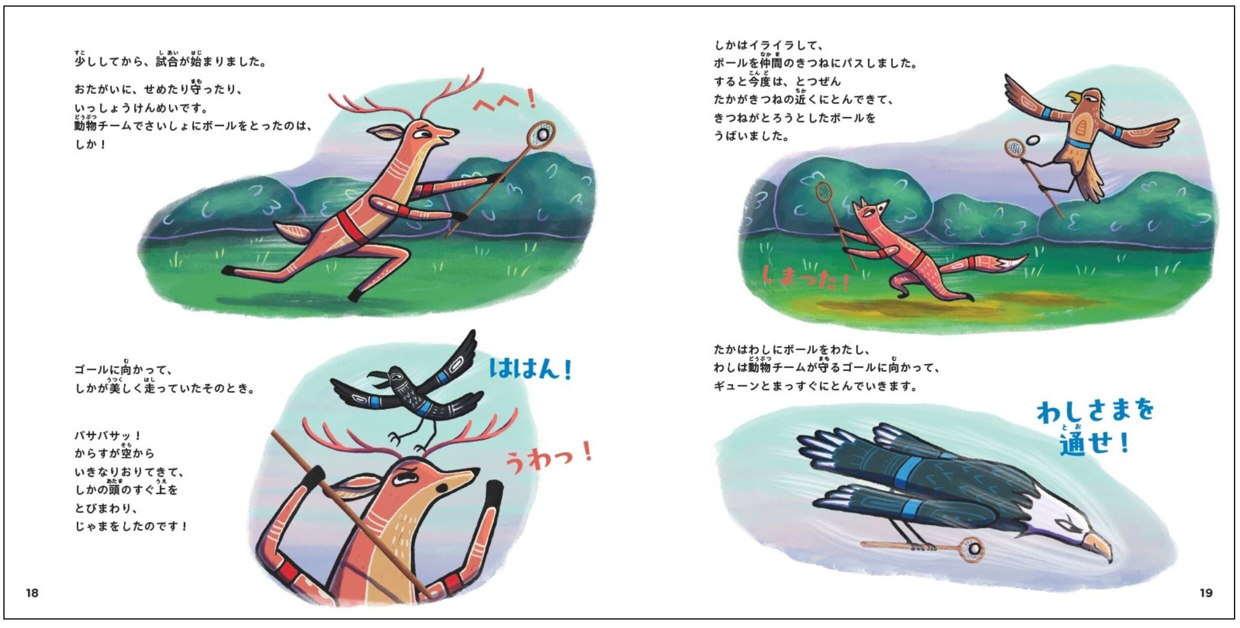 ボールゲームとは、アメリカ先住民の伝統的なスポーツ。2028年のオリンピックから正式種目となるラクロスの起源であるとも言われています。この絵本で描かれるのは、空を飛ぶ鳥たちと大地の動物たちが、ボールゲームで熾烈な戦いを繰り広げ、その中で大切なことに気づくおはなし。そしてこのおはなしは、「偉大なるボールゲーム」として、アメリカ先住民の間で何百年にも渡って語り継がれてきました。