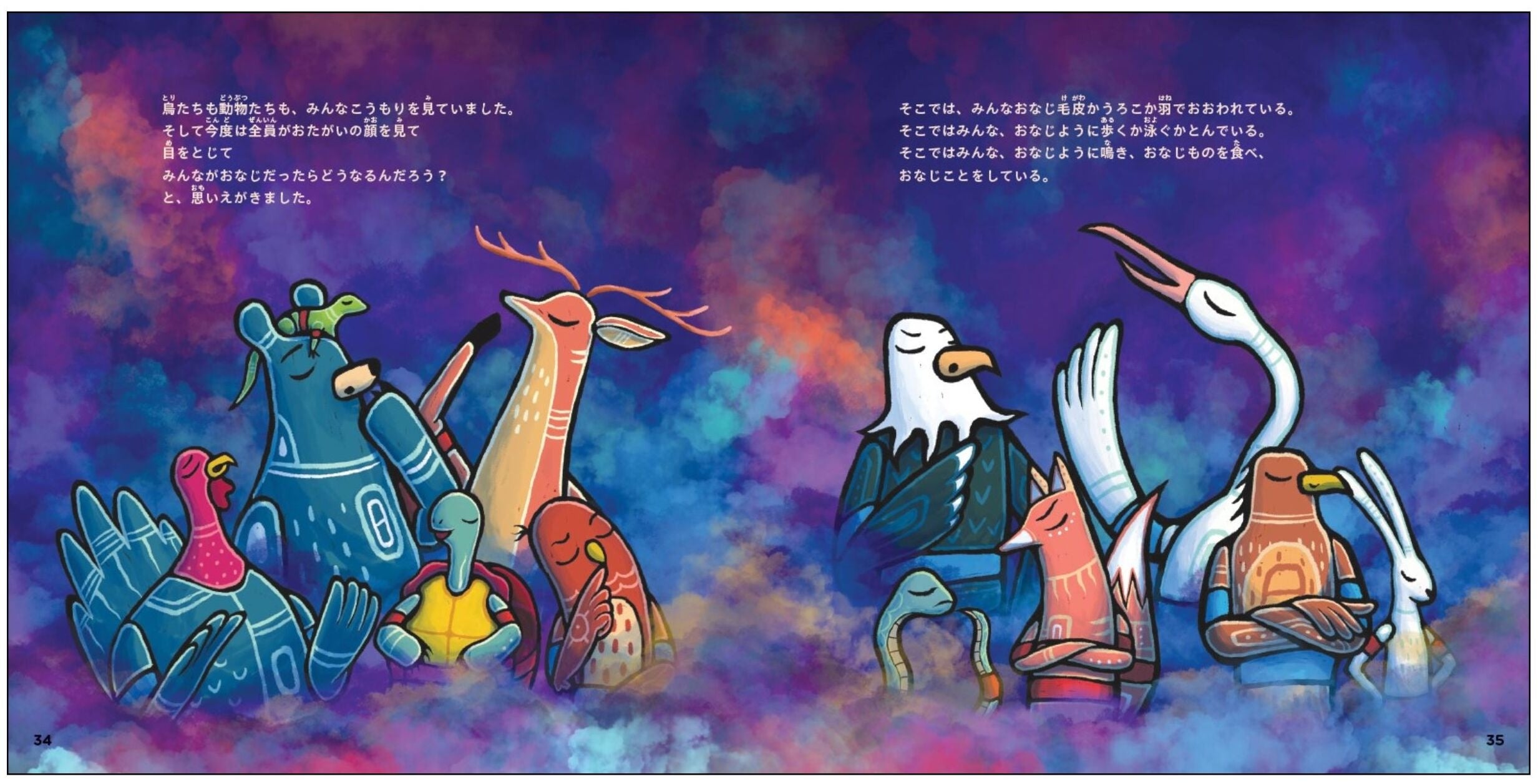 住んでいる場所や姿形、生きてきた時代や受けてきた教育。自分と同じ人はどこにもいません。もしかしたら、みんなとちがうことで嫌な思いをしてしまう人も、たくさんいるのかもしれません。しかし、このおはなしは、この「ちがい」を生かすこともできるのだよ、と教えてくれます。