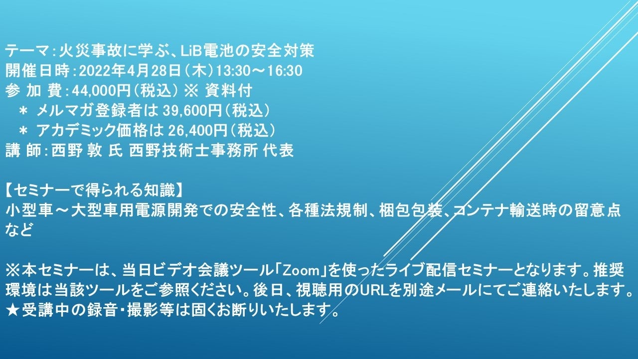 先端技術情報や市場情報を提供している(株)シーエムシー・リサーチ(千代田区神田錦町: https://cmcre.com/ )では、 各種材料・化学品などの市場動向・技術動向のセミナーや書籍発行を行っておりますが、 このたび「火災事故に学ぶ、LiB電池の安全対策」と題するセミナーを、 講師に西野 敦 氏 西野技術士事務所 代表)をお迎えし、2022年4月28日(木)13:30より、 ZOOMを利用したライブ配信で開催いたします。 受講料は、 一般:44,000円(税込)、 弊社メルマガ会員:39,600円(税込)、 アカデミック価格は26,400円(税込)となっております(資料付)。